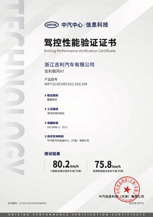 『控得住』是驾驶信心的基础。吉利银河A7的整车重心被降低至同级最优水平,搭配轻量化铝质转向节(簧下质量降低50%),让底盘响应更『跟手』。路特斯工程师通过调整悬架刚度、减震器阻尼曲线,将侧倾梯度控制在『安全提醒』与『乘坐舒适』的黄金区间——既让驾驶者感知到侧倾的发生(避免过度操控),又不会让乘客感到不适。这种平衡在麋鹿测试中得到验证。80.2km/h的通过速度,不仅获得《中汽中心驾控性能验证证书》,更超越多数同级车型,甚至接近性能车水平。有测试车手评价。『紧急变向时,车身姿态稳定得像被「无形之手」扶住,完全没有拖沓感。』