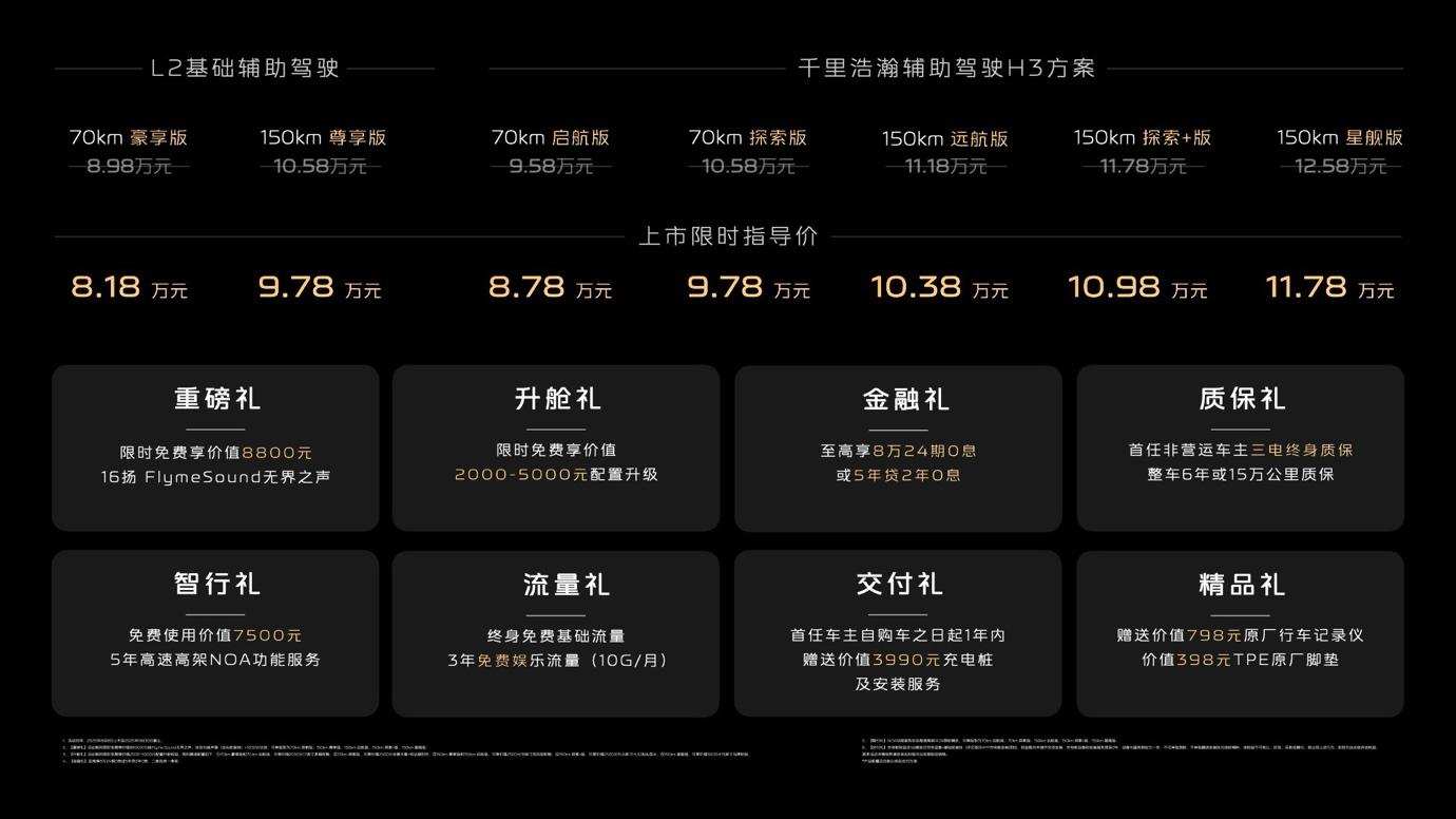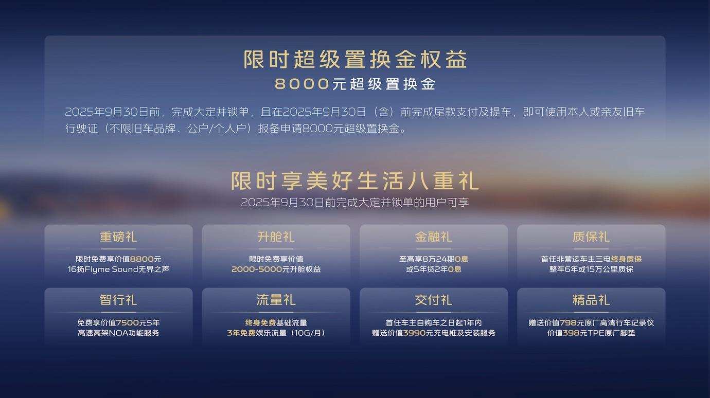 8.18万元的起售价,较比亚迪秦系列等竞品更低,当然其价格体系更是建立在『价格一步到位』与『权益叠加』的组合拳之上:除了不限品牌的8000元超级置换金,还有价值8800元的16扬Flyme Sound音响、3990元的充电桩及安装权益等八重购车权益。