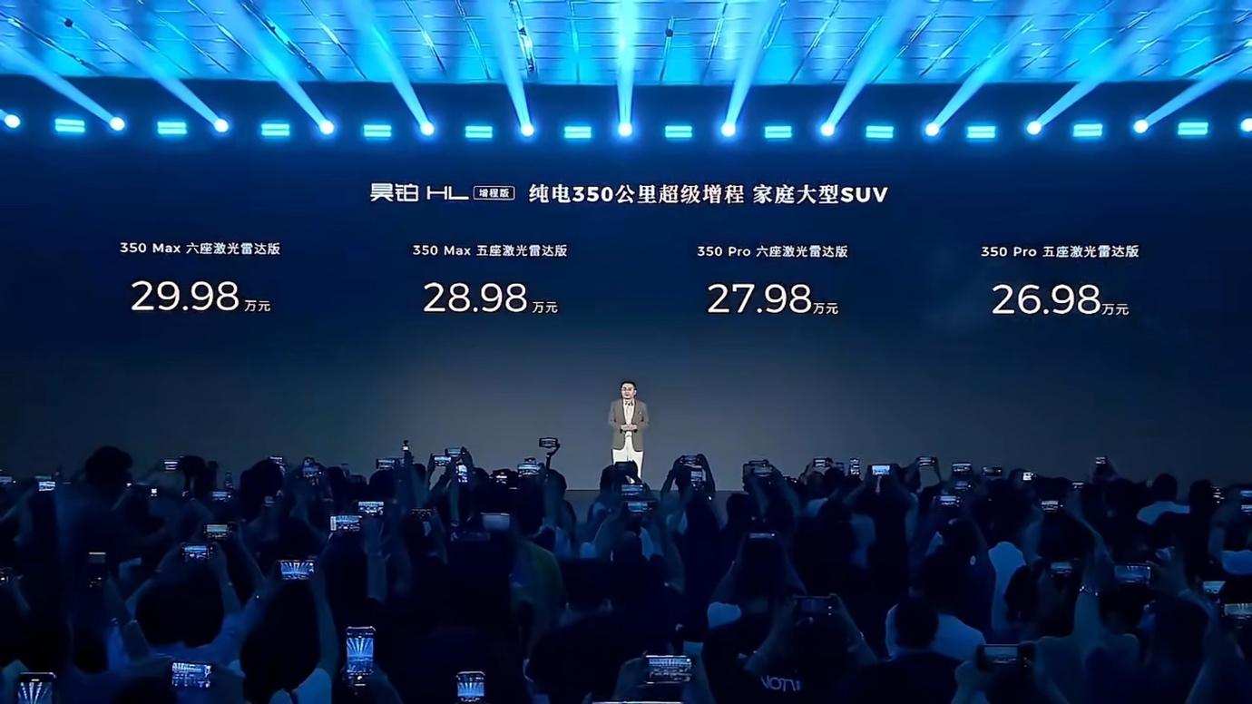 昊铂HL增程版推出四个版本车型,价格区间26.98万-29.98万元,具体如下:350Pro五座激光雷达版26.98万元,350Pro六座激光雷达版27.98万元,350Max五座激光雷达版28.98万元,350Max六座激光雷达版29.98万元。