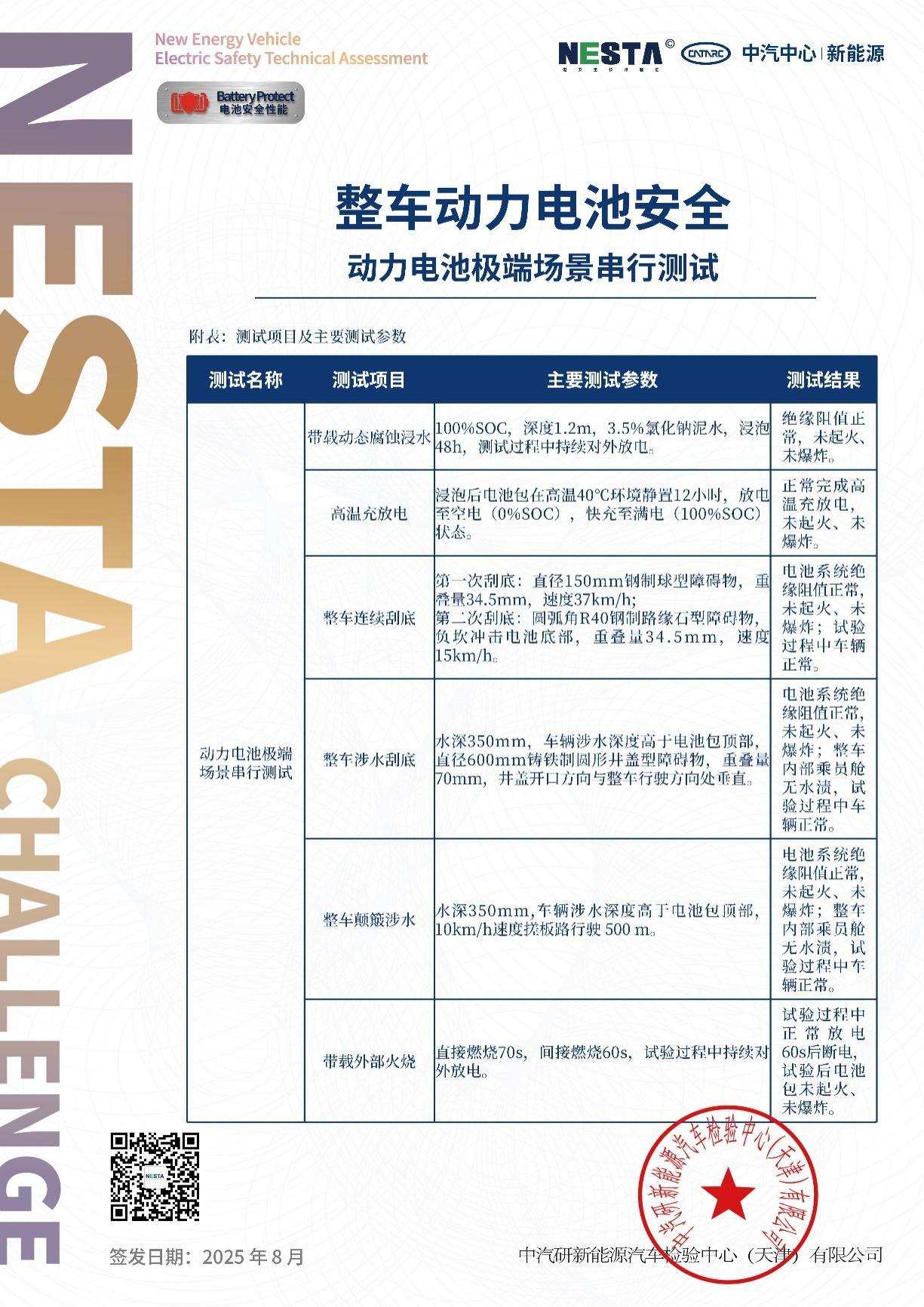 更具行业意义的是,神盾金砖电池成功挑战了行业首个『整车+整包』带电六大串行极端测试,该测试由中汽中心新能源检验中心主导,测试对象为搭载神盾金砖电池的领克10EM-P整车及电池整包,测试过程中电池处于满电状态且持续对外放电,更贴近用户实际用车场景。测试采用同一个电池包,连续进行『带载动态腐蚀浸水、高温充放电、整车连续刮底、整车涉水刮底、整车颠簸涉水、带载外部火烧』六大极限测试。其中,带载动态腐蚀浸水测试在100%SOC、深度1.2m、3.5%氯化钠泥水环境下浸泡48h,浸泡时间为新国标要求的24倍,且新国标无深度要求。