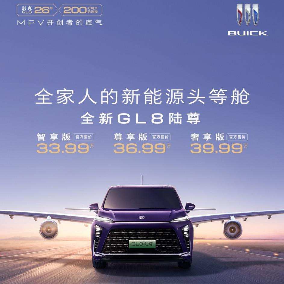 2025年8月26日,别克品牌正式推出豪华新能源MPV——全新GL8陆尊,此次上市的车型包含智享版、尊享版、奢享版三款配置,均为豪华艾维亚版本,官方售价区间为33.99万元至39.99万元。