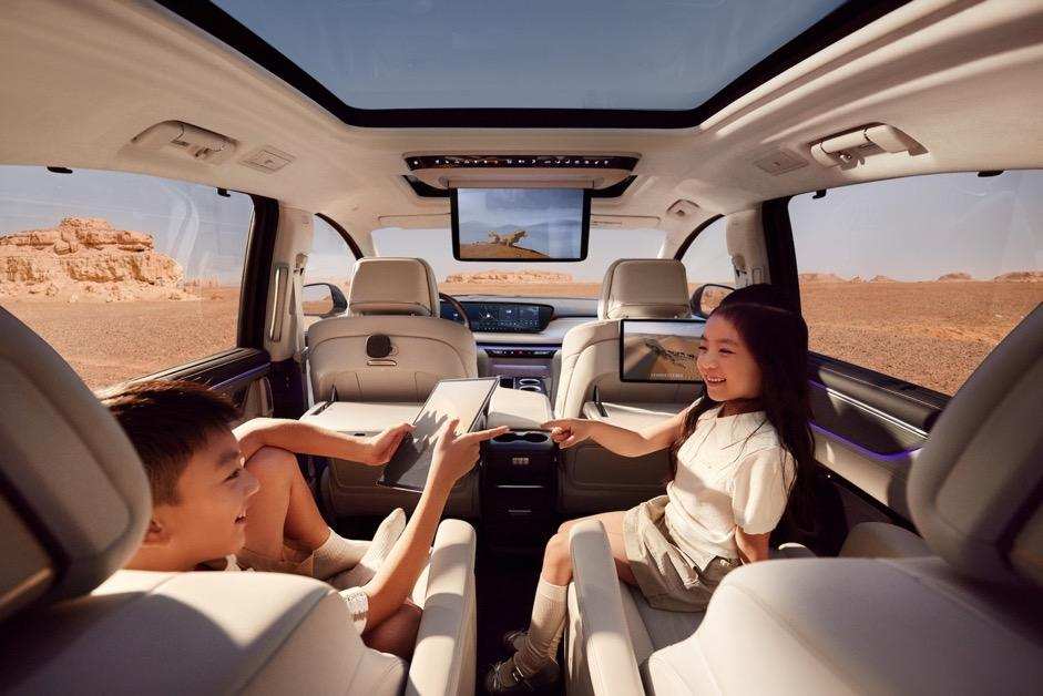 同时,系统集成百度生态及车载应用,涵盖在线音乐、有声读物、长短视频等内容,后舱15.6吋智慧屏支持屏幕角度电动调节、触控/蓝牙/无线飞鼠多模式控制及多模式智能投屏,后排乘客可独立观看视频或使用应用,避免『前排看导航、后排无娱乐』的情况。