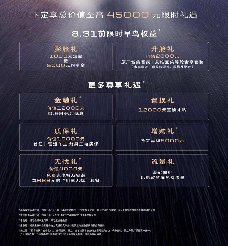 在购车权益方面,别克为全新GL8陆尊用户提供了总价值4.5万元的礼遇,覆盖『下定-购车-用车』全周期。其中,限时早鸟权益具有较强的吸引力。用户需在2025年8月31日24点前完成线上下定及定金支付,并于2025年10月31日24点前完成车辆交付及开票,即可享受『膨胀礼』与『升舱礼』——1000元定金可抵5000元购车款,直接降低购车门槛,同时获赠价值2000元的艾维亚头等舱奢享套装(含超柔软颈枕、腰靠及拖鞋)及原厂智能香氛,从细节处提升用车的豪华感。