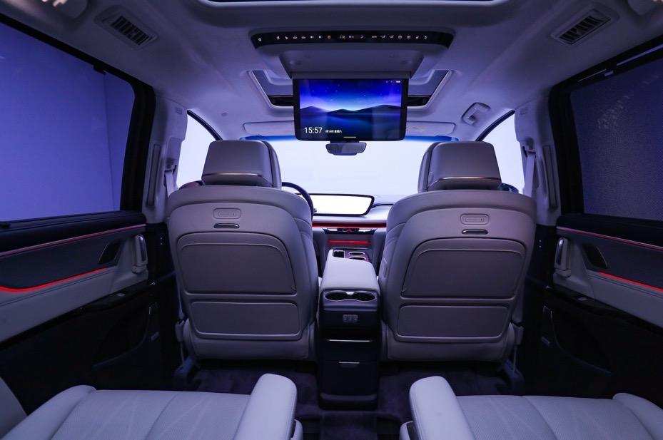 二排座椅升级为Nappa真皮羽感头等舱座椅,电动调节支持320mm超长行程,用户可通过一键VIP功能激活『云端模式』,仅需一指轻点就能将座椅调整至最舒适状态,配合智享空间等智能场景模式的环境渲染(如调节空调温度、氛围灯颜色),让乘客在行程中获得片刻放松。