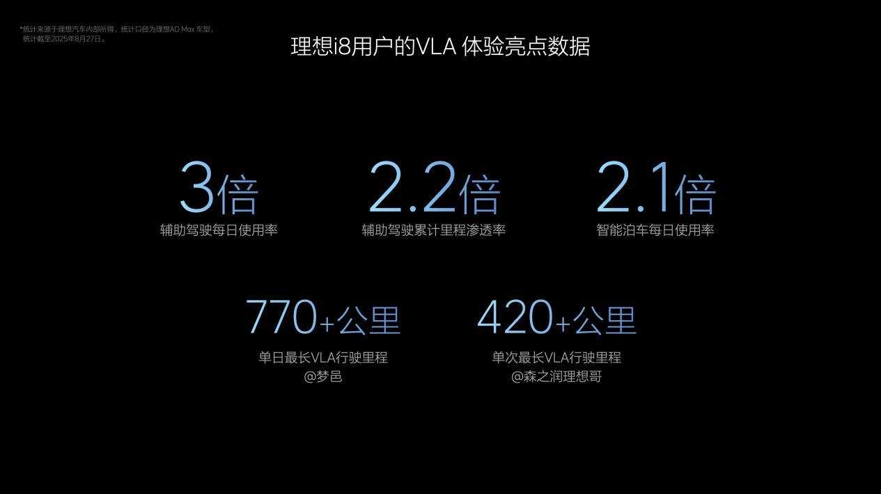 自8月20日理想i8与VLA司机大模型同步交付以来,市场反响热烈。首批理想i8用户中的单日最长VLA行驶里程超770公里,单次最长VLA行驶里程超420公里。VLA随理想i8上市交付后,辅助驾驶每日使用率提升3倍,累计里程渗透率提升2.2倍,泊车每日使用率提升2.1倍,也意味着VLA司机大模型成为了用户真的爱用且好用的辅助驾驶。