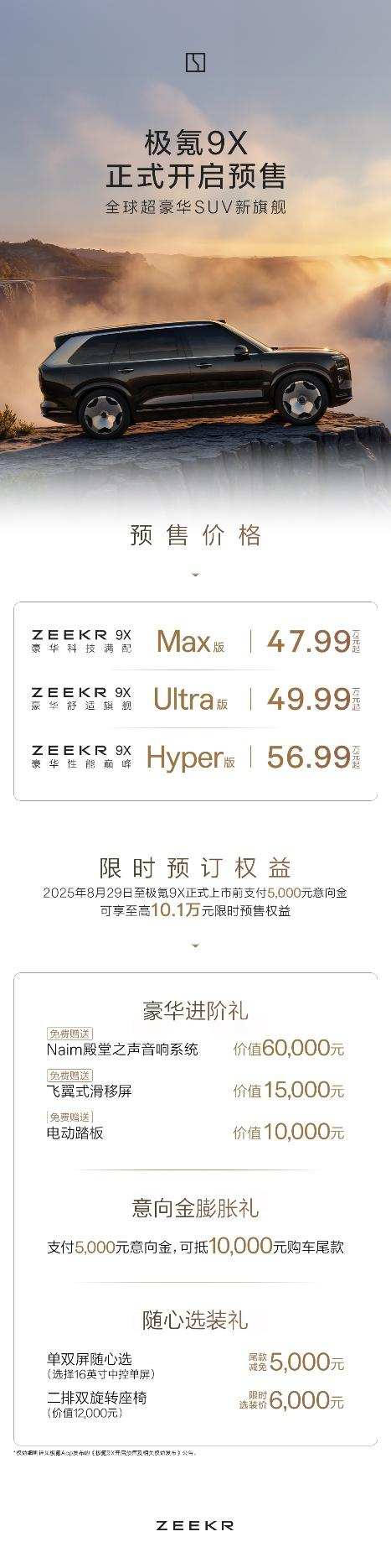 8月29日,在2025成都国际车展开幕首日,全球超豪华SUV新旗舰——极氪9X正式开启预售,共推出Max版、Ultra版、Hyper版三个版型,预售价格分别为47.99万元起、49.99万元起、56.99万元起。即日起,用户可通过极氪App、极氪官网、极氪小程序、全国各大城市的极氪门店等官方渠道进行预定。