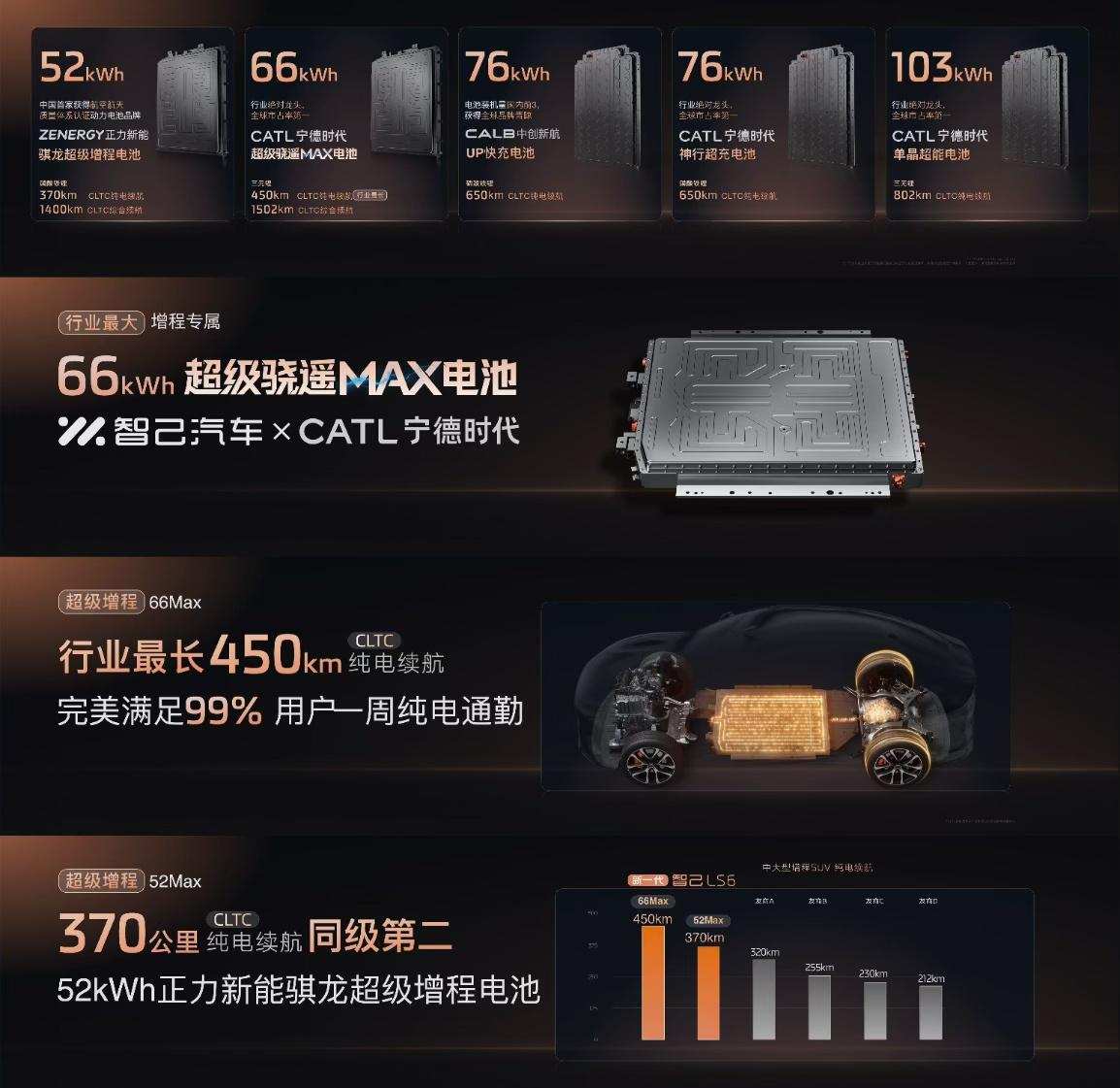 其中最受关注的『恒星超级增程』技术,并非传统增程的简单迭代,智己汽车CTO项娇坦言:『我们希望做的不是迭代一个增程车,而是真正做到断代,是能够消除大家所有的焦虑,同时又能带给大家极强的电动感、电动化、智能化所有最新体验的一台车。』该技术提供宁德时代66度与52度两种电池版本,对应超级增程66Max版与52 Max版,其中66度电池版本可实现450公里纯电续航,52度版本纯电续航也达370公里——这一数据已远超同级别增程车型的『顶配水平』。同时李微萌在回应配置策略时提到的,『Max版本入门就有370公里的纯电续航,几乎是目前所有其它增程友商的超级顶配,我们以「入门即顶配」的方式给到用户』。