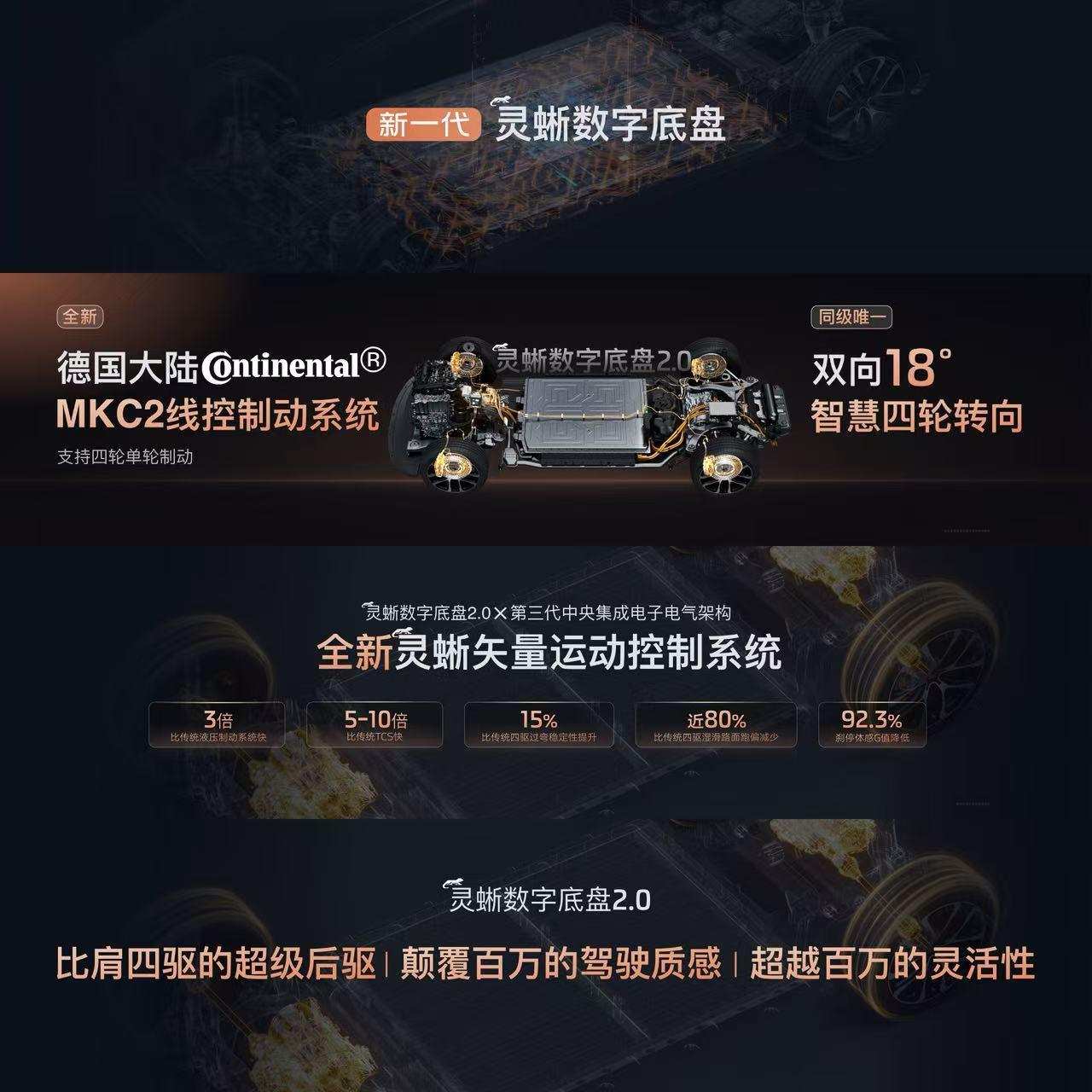 除了增程技术,新一代『灵蜥数字底盘』的升级也为产品力加分。据悉,该底盘具备同级独有的『灵蜥爆胎稳定控制』,可确保高速、弯道爆胎时车辆稳定行驶;『主动防侧翻2.0』技术能降低45%侧倾风险;而『灵蜥超级后驱』设计,既保证高速变道、湿滑路面的稳定性,还可覆盖80%传统四驱的脱困场景。