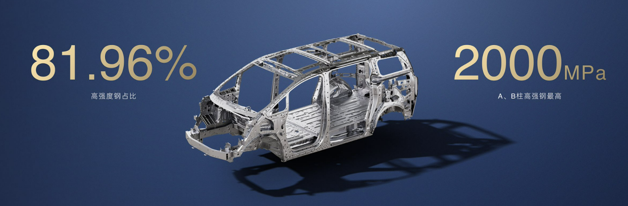 为打造MPV安全新标杆,高山7采用三重高强度笼式车身结构,高强度钢占比达81.96%,A、B柱集成2000MPa高强钢,强度同级最高。