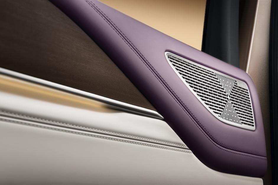 而顶棚、立柱护板选用麂皮材质,配合天然纯羊毛脚垫,从触感与视觉上构建了高端质感。扬声器面罩的『套方纹窗』设计,源自传统建筑的吉祥符号,既保留文化内涵,又与现代座舱风格融合。