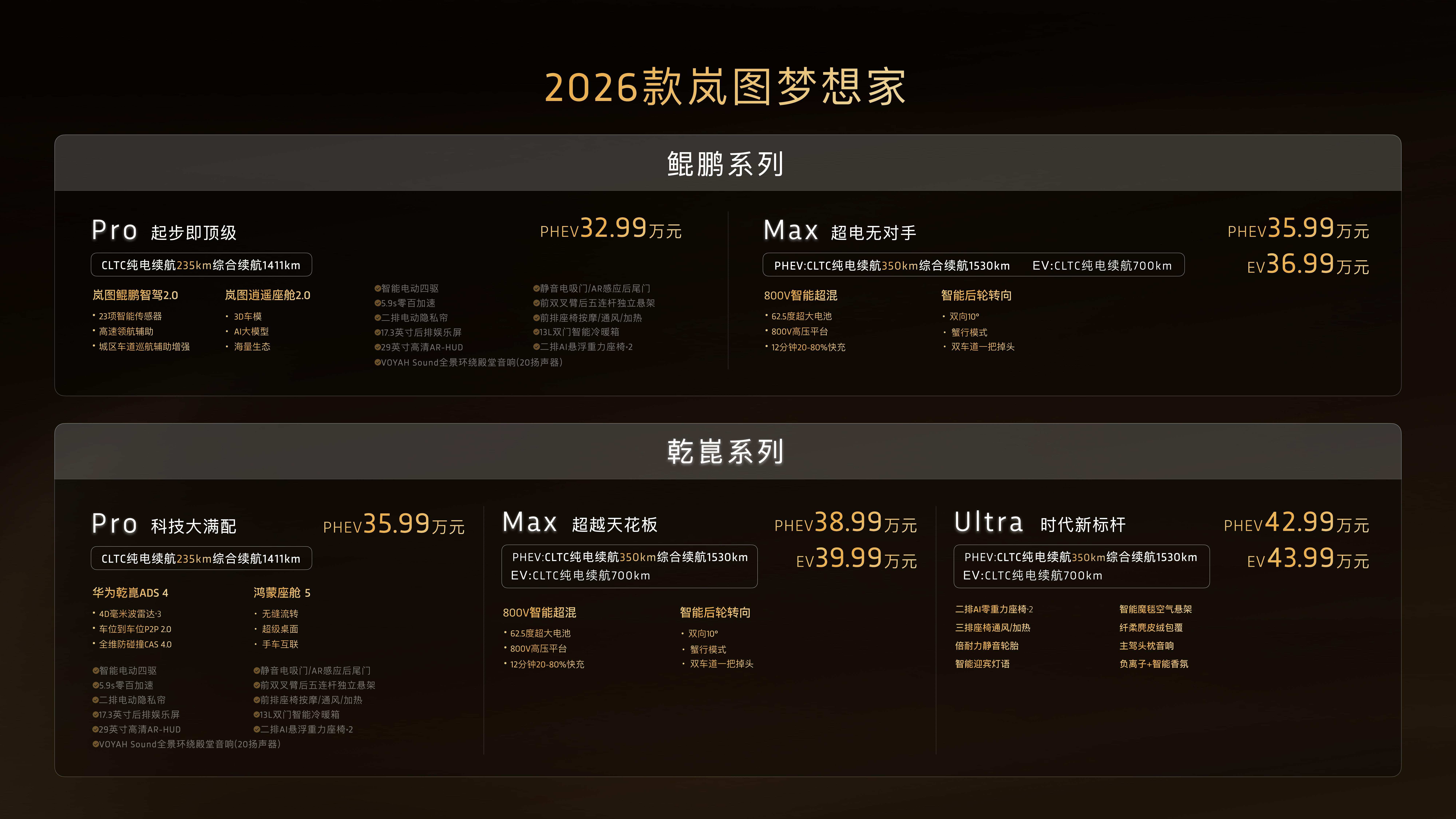 这款备受期待的新能源MPV此前在成都车展开启预售后,一小时订单突破10000台,展现出惊人的市场热度。9月15日,2026款岚图梦想家正式上市,售价区间为32.99-43.99万元。新车推出鲲鹏系列以及乾崑系列,共8款车型,包含PHEV和EV两种动力形式。相比主要竞争对手腾势D9、魏牌高山和别克GL8,2026款岚图梦想家在价格保持竞争力的同时,在配置和技术层面实现了显著升级。