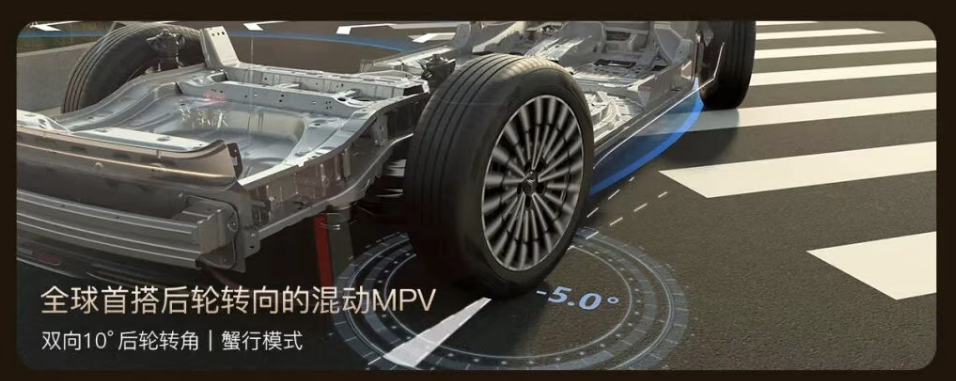 新车还配备智能后轮转向系统,转向角度为正负5度,支持蟹行模式,让5.3米的大车身也能轻松实现双车道一把掉头,改变了人们对MPV『大车不灵活』的刻板印象,不过这项配置在鲲鹏系列和乾崑系列入门的两个Pro版都是没有的。