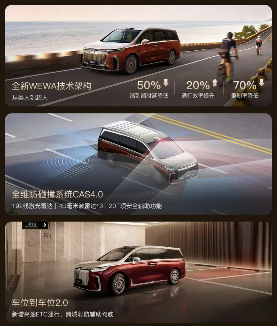 对应华为ADS Max超阶版,能够支持城市NCA领航、高速NCA领航,具备大型收费站ETC车道自动通行、高速施工路段自动绕行等功能,还支持跨层泊车代驾VPD2.0、车位到车位2.0等,极大提升了驾驶的便利性与安全性。
