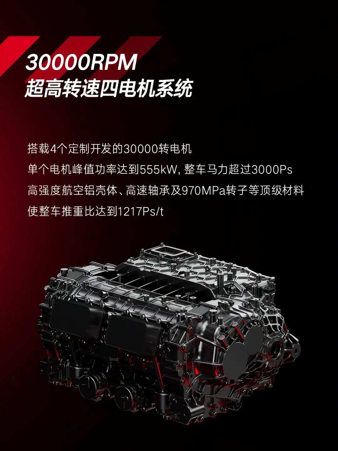 要实现496.22km/h的极速与6分59秒157的圈速,核心动力与技术架构的突破是根本。仰望U9X搭载了全球首个量产全域1200V超高压平台,配合四台转速高达30000rpm的高性能电机,电机壳体采用高强度航空铝材质,内部配备高速轴承与970MPa高强度转子,一系列顶级材料的应用,让整车综合马力突破3000Ps,推重比更是达到1217Ps/t的全球顶尖水准。