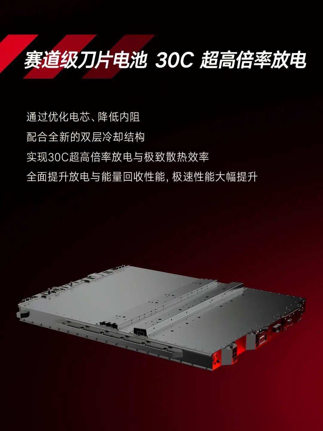 而赛道级刀片电池的升级更具行业突破性:通过优化电芯结构与内阻,配合全新双层冷却设计,这款磷酸铁锂电池实现了30C的超高放电倍率,不仅大幅提升了车辆的加速能力与能量回收效率,更打破了『磷酸铁锂性能弱于三元锂』的行业固有认知,为磷酸铁锂电池在高性能领域的应用树立了新标杆。