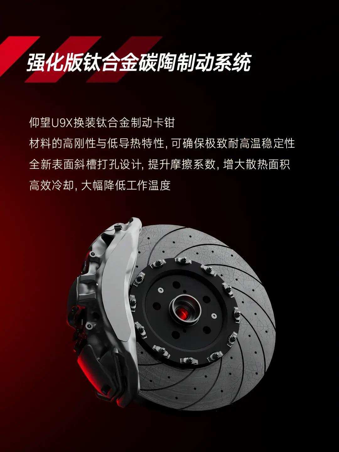 在赛道场景中,制动性能的可靠性直接决定车辆的操控极限与安全边界,仰望U9X在这一环节同样进行了针对性强化。新车配备全新钛合金碳陶制动系统,其中升级后的碳陶制动盘采用打孔划线设计,既提升了摩擦系数,又强化了散热效能;钛合金材质的制动卡钳则在减轻簧下质量的同时,提供了精准无虚位的制动脚感,其低导热性更从根源上杜绝了高速制动时刹车油沸腾的风险。