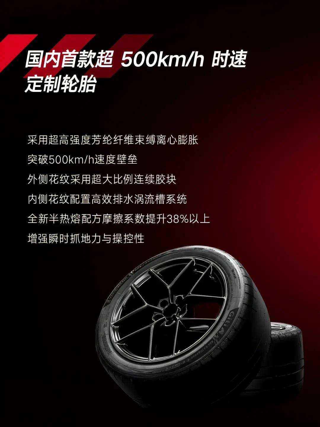 这款赛道级轮胎采用了广泛应用于防弹衣的超高强度芳纶纤维,能有效抑制高速行驶时的轮胎离心膨胀,其强度足以支撑500km/h以上的行驶速度,为U9X的极速突破提供了安全基础。非对称赛道花纹设计则兼顾了弯道抓地力与湿滑路面的排水能力,而胎圈至胎侧关键过渡区域的结构性增强,更让轮胎能应对超高G值的稳态过弯,全方位保障了车辆在高速与弯道中的操控稳定性。