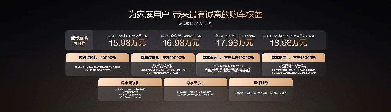 此次,唐DM-i智驾版 175KM长续航版共推出3款车型,售价17.98万~19.98万元(10月31日前完成购车可享10000元置换补贴)。同时,比亚迪还为用户准备了包含置换补贴在内的至高价值4.3万元盛唐礼遇。