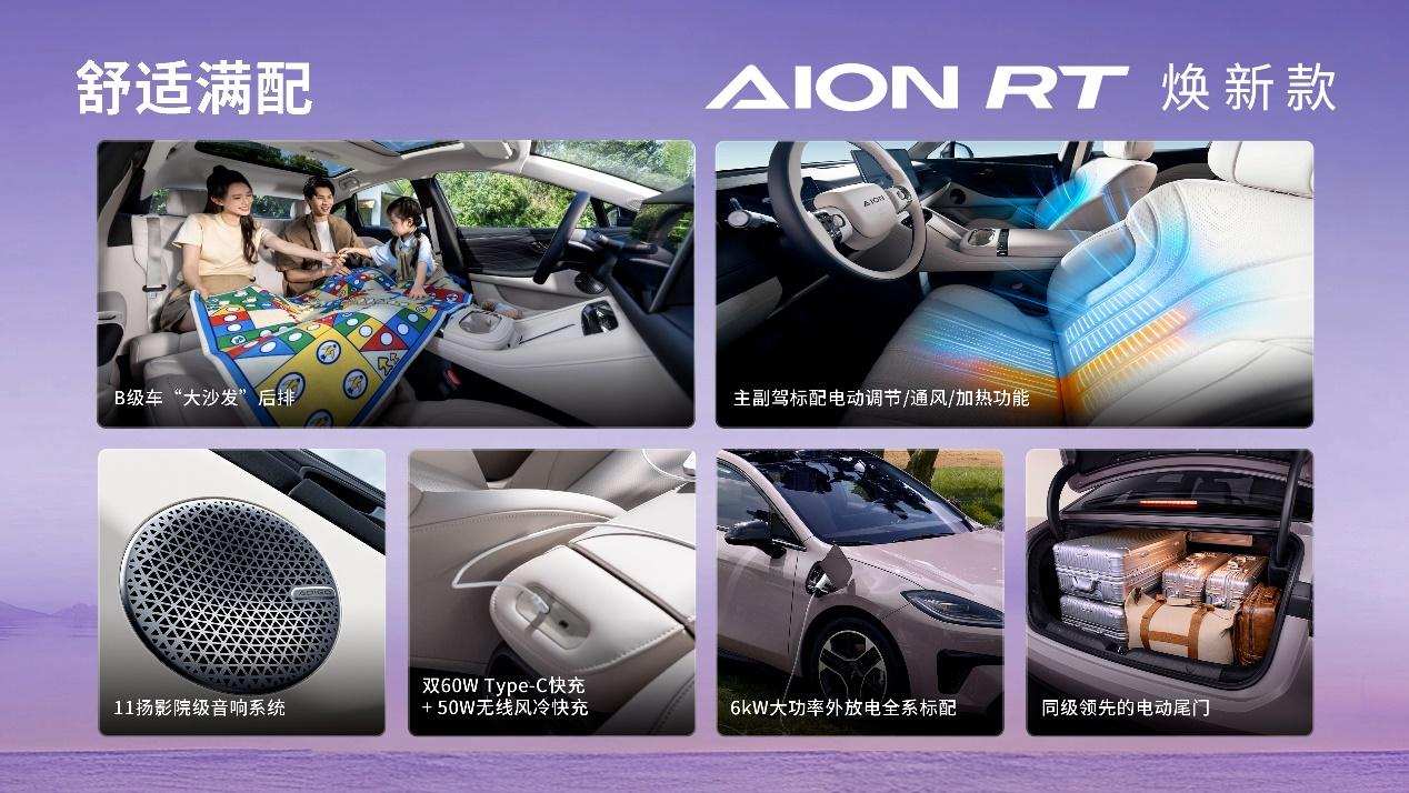 AION RT焕新款秉持“家的空间,不止于大”的原则,凭借B级车体量、940mm后排头部空间与943mm腿部空间,彻底告别压抑感,配合同级最大320mm坐高、95°躯干角与豪华软包座椅,1.85米身高乘客也能舒展坐姿。