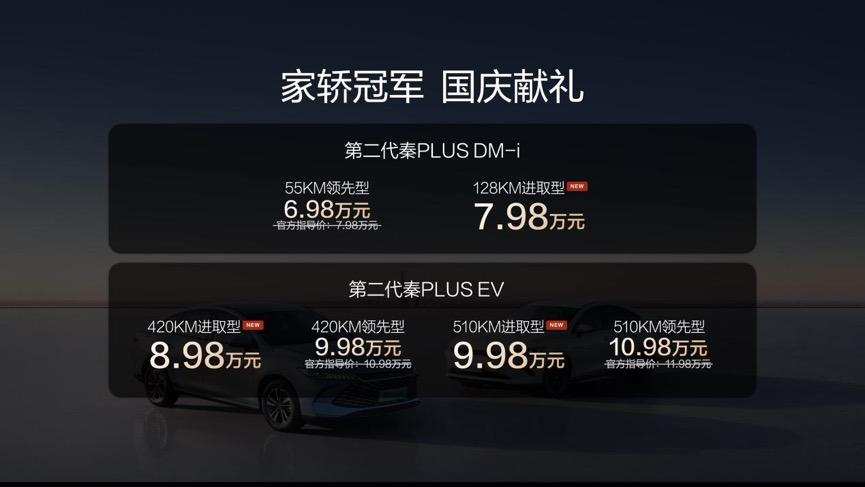 首先得明确一个前提:『全系限时6.98万元起』,但用户问的『7.98万起』,其实是第二代秦Plus DM-i的核心上新版本——128KM进取型。这次第二代秦Plus双车同步上新,DM-i系列加推了128KM进取型,官方指导价7.98万元(限时国庆献礼价保持这个水平);而EV系列的进取型则是8.98万元起(420KM版本)和更高的510KM版本。