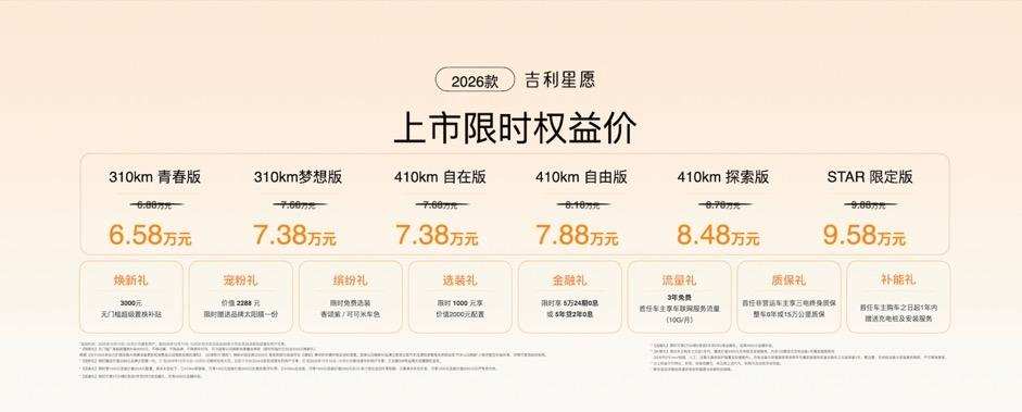 2025年10月10日,2026款吉利星愿在杭州举办的用户大会上正式上市,不仅延续了『起步即高配』的产品基因,更通过6个版型的精准布局、八重限时购车权益的推出,以及STAR限定版的新增,进一步强化了其在细分市场的标杆地位。