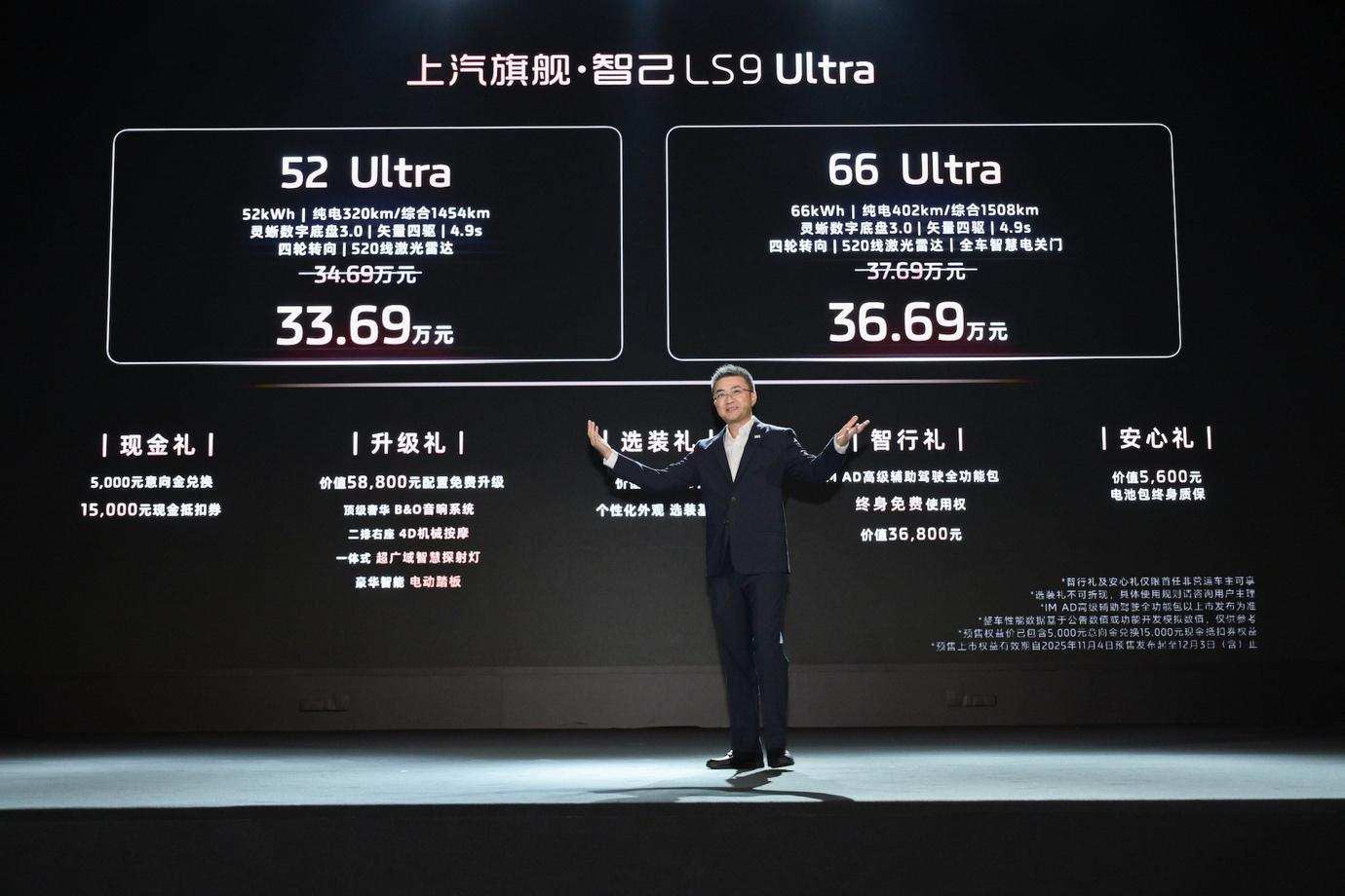 11月4日,上汽集团旗下高端品牌智己汽车宣布,其旗舰大六座SUV智己LS9正式开启预售。此次新车共推出两个版本,52 Ultra版预售权益价33.69万元,66 Ultra版预售权益价36.69万元。