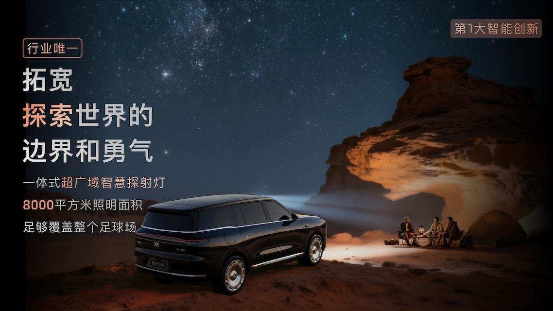 除了常规的辅助驾驶感知,智己LS9还针对特定场景进行了优化。例如,行业唯一的一体式超广域智慧探射灯,照明面积达8000㎡(相当于一个足球场),可在高速夜间行驶时增强照明,或在露营时提供补光,既提升了安全性,也丰富了户外使用场景。