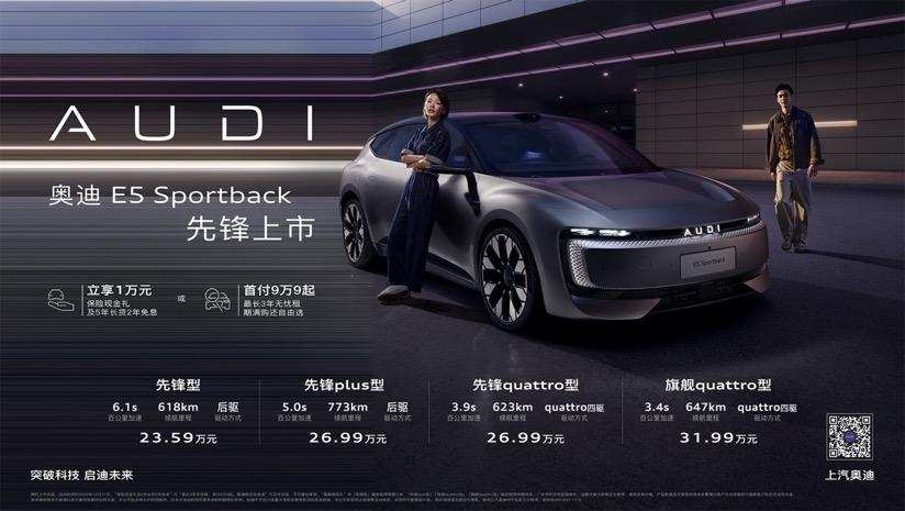 从定价来看,这款车于9月16日上市时,推出先锋型、先锋plus型、先锋quattro型和旗舰quattro型共4款配置,臻享价23.59万元起,叠加万元保险现金权益后,正式进入22万级区间。这一价格带,与奥迪部分燃油中型车(如A4L)的终端价格相近,让原本考虑豪华燃油中型车的用户,无需大幅提升预算即可选择电动车型,实现了『同价位下的动力升级』。
