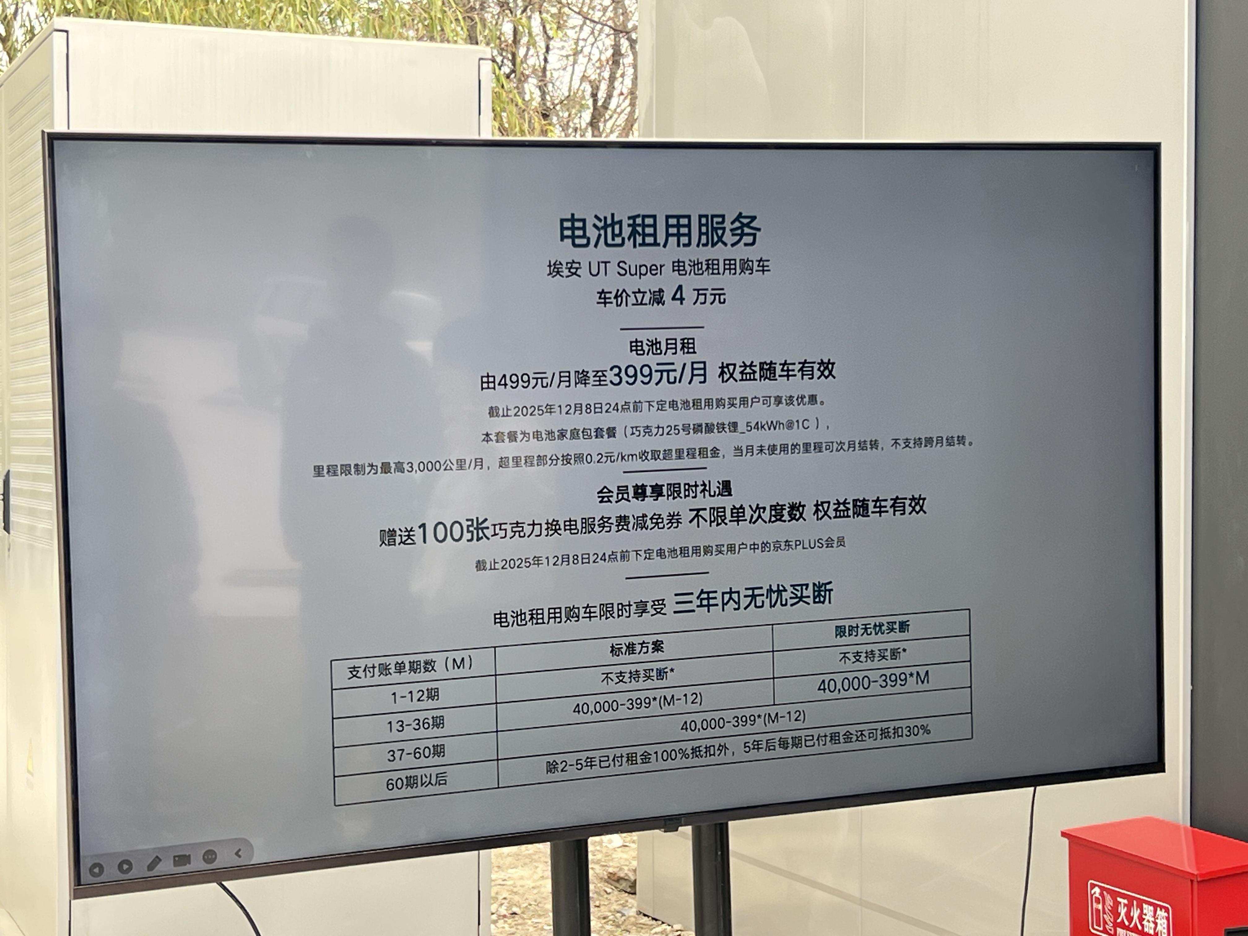 在切入试驾体验前,先明确埃安 UT super 的核心购车政策,这也是它最吸引消费者的亮点之一。车型采用 “车电分离” 的电池租用方案,用户无需一次性支付电池费用,仅需 4.99 万元即可提车,相比整车购买直降 4 万元。