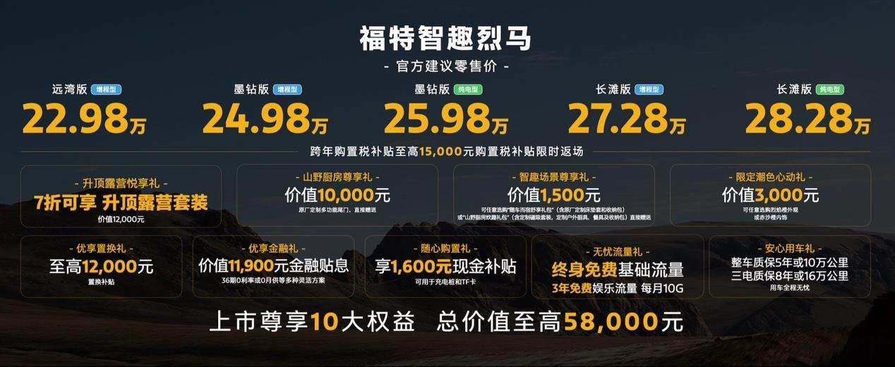 为强化市场竞争力,福特同步推出总价值至高5.8万的『十大尊享权益』,覆盖购车、用车、玩车全周期。权益包括7折享受价值12000元的升顶露营悦享礼、直接赠送的价值10000元山野厨房尊享礼、至高15000元的跨年购置税补贴、至高12000元置换补贴,以及价值11900元的金融贴息等。