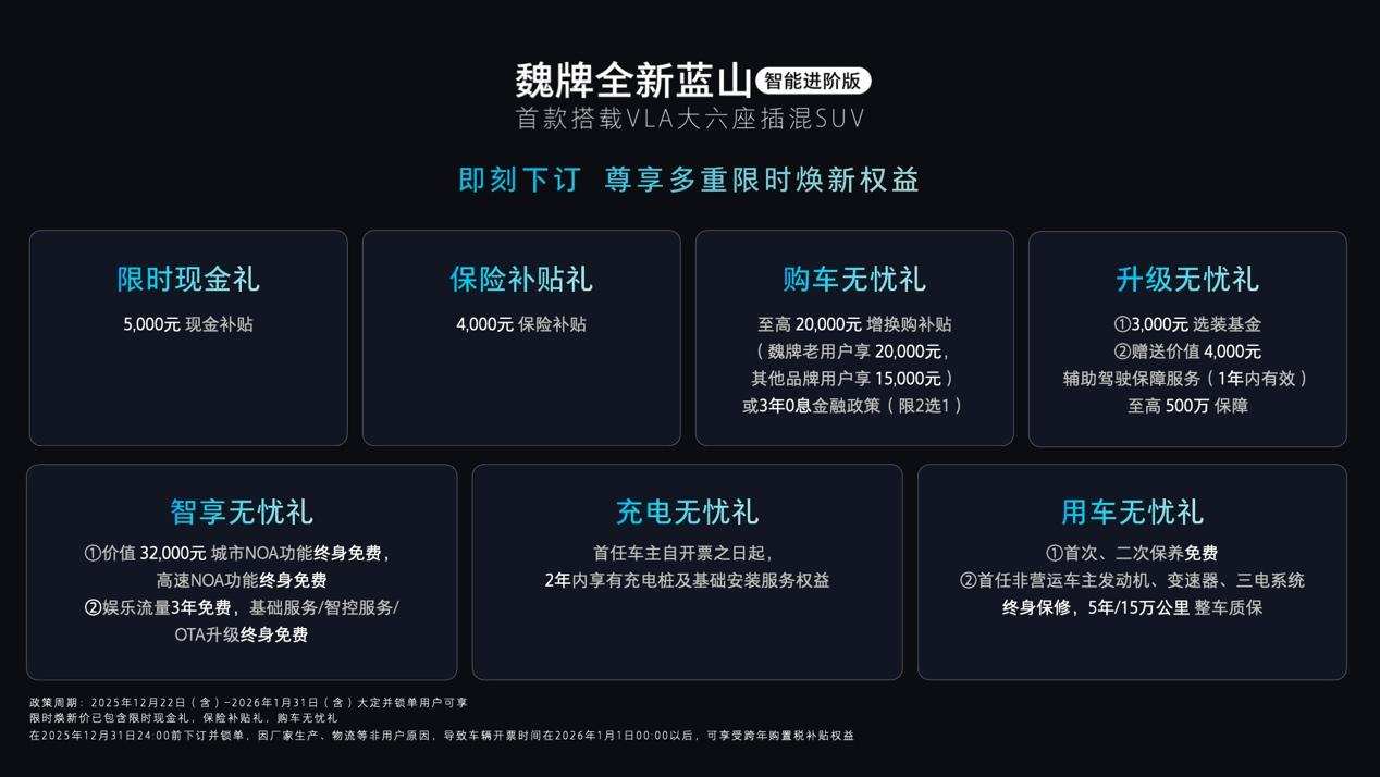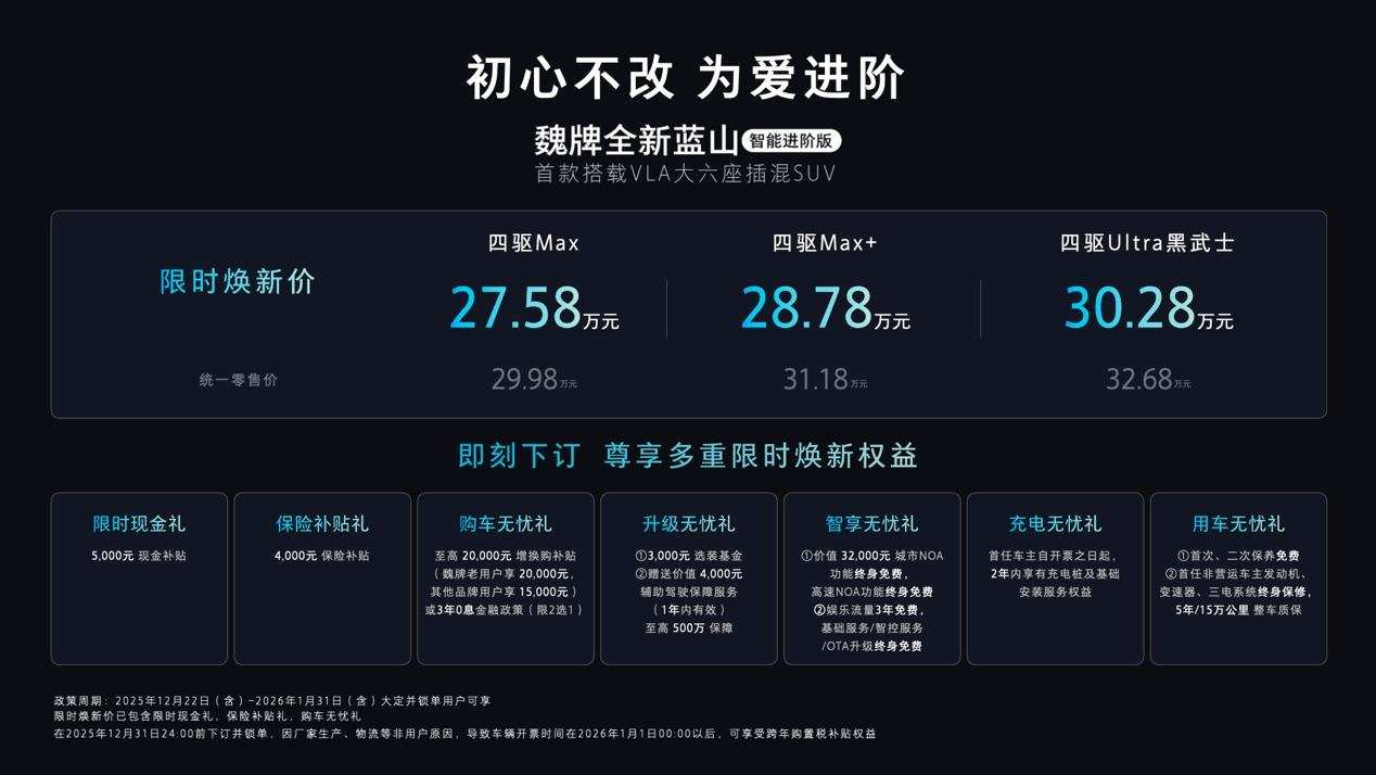 2025年12月22日,魏牌全新蓝山智能进阶版正式上市,限时焕新价27.58万元起,定位『首款搭载VLA大六座插混SUV』。