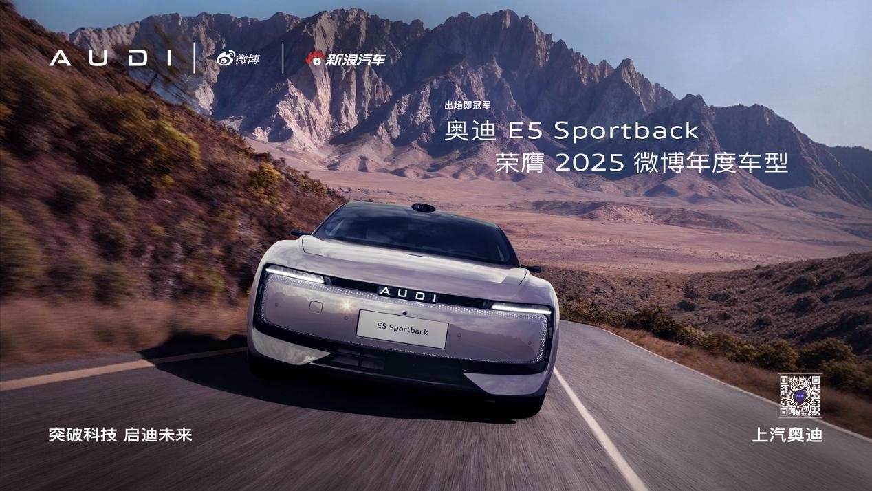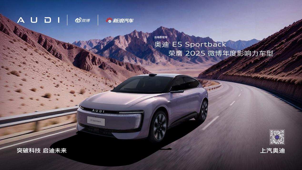 2026年初,奥迪E5 Sportback以全新品牌首款车型的身份,获得了『2026 CCOY年度车』大奖,成为该奖项设立以来首个在品牌发布当年即获此殊荣的产品。同时也获得了微博平台颁发的『2025微博年度影响力车型』以及『2025微博年度车型』两项大奖。