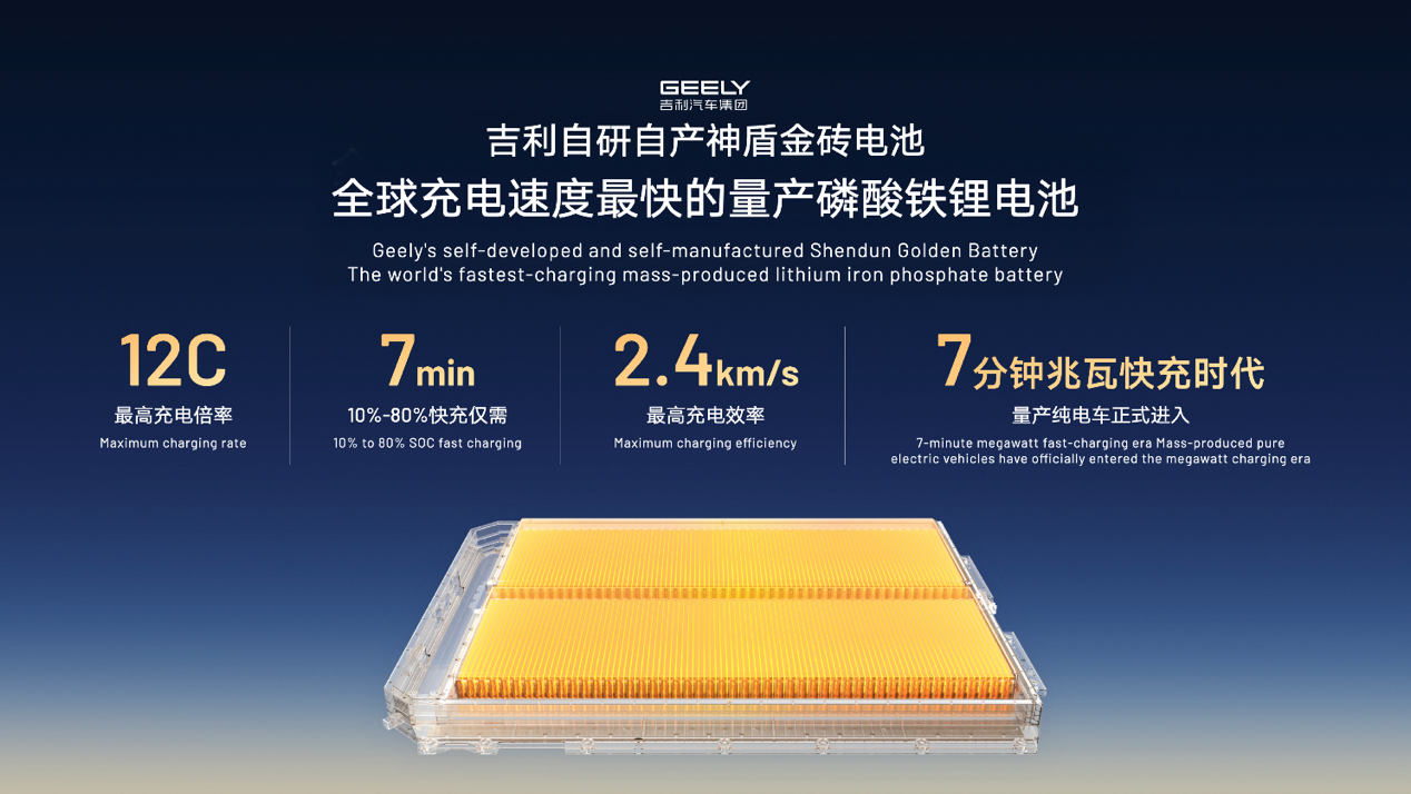在动力电池领域,吉利自研自产的神盾金砖电池已实现量产应用,该电池作为全球充电速度最快的量产磷酸铁锂电池,最高充电倍率可达12C,10%~80%电量补能最快仅需7分钟,推动量产纯电车进入『7分钟兆瓦快充时代』。