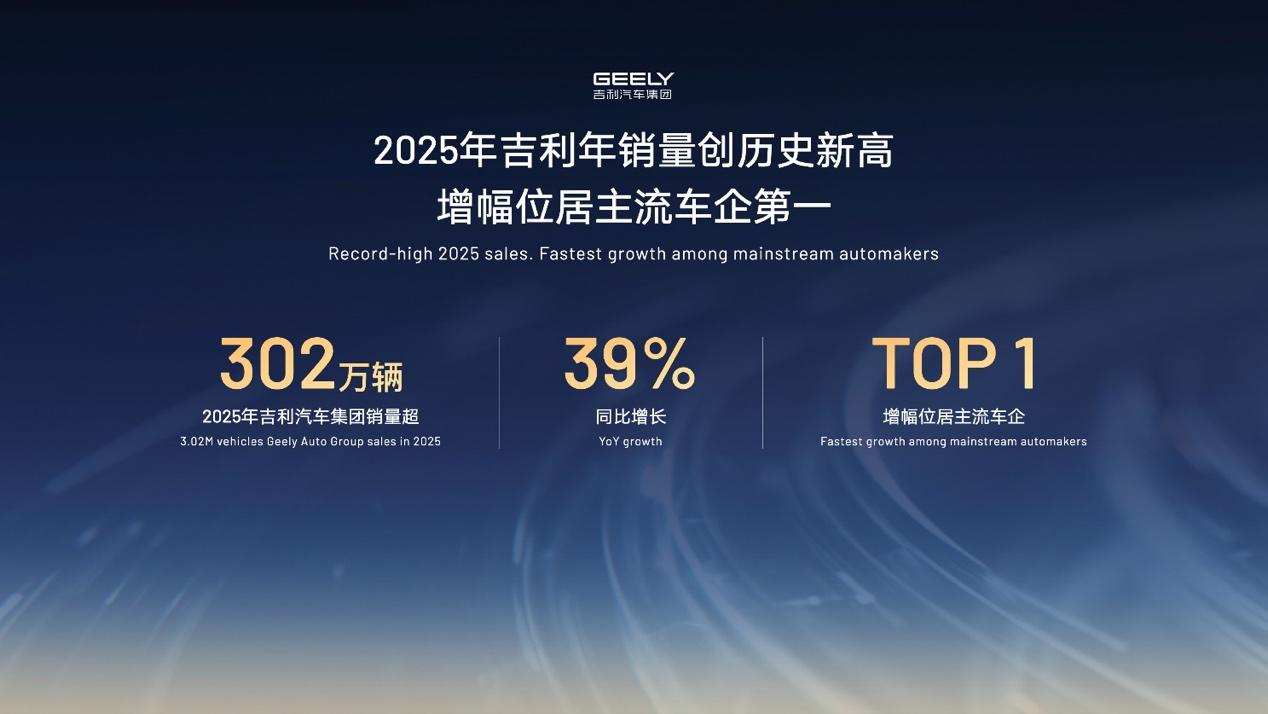从市场基础来看,吉利2025年的销量表现为新技术落地奠定了良好基础。官方数据显示,2025年,吉利汽车集团累计销量达302万辆,创下历史新高,同比增长39%,增幅位居主流车企第一位。在此基础上,吉利将2026年的年度销量目标定为345万辆,其中出口销量目标64万辆,i-HEV智能双擎车型的推出将成为冲击这一目标的重要力量。
