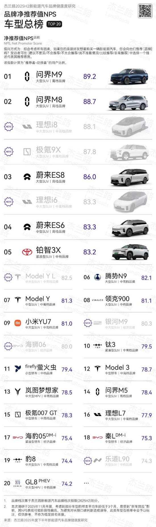 在用户口碑方面,问界品牌及产品同样展现出强劲的号召力。在前不久杰兰路发布的《2025下半年新能源汽车品牌健康研究报告》中,问界荣获品牌NPS(净推荐值)第一、品牌发展信心指数第一、30万元以上品牌百人青睐指数第一,成为高端汽车市场中第一个、也是唯一一个连续三次获得品牌发展信心指数第一的品牌;其旗下的问界M9获得车型NPS (净推荐值) 第一,连续四次蝉联NPS(净推荐值)第一,成为新能源SUV车型中第一个、唯一一个达成此成就的车型,首次参评的问界M8也位列车型NPS(净推荐值) 第二。