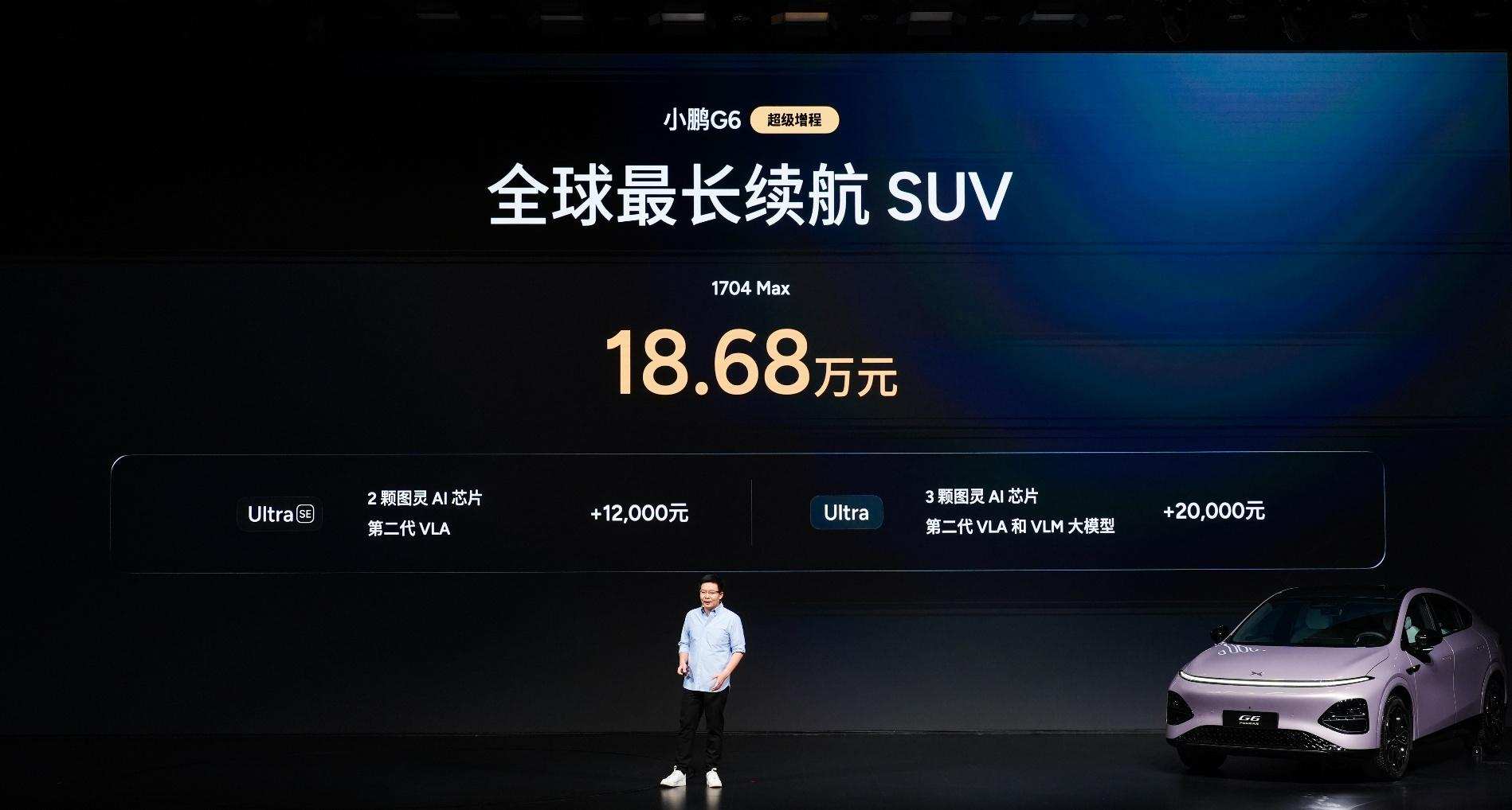 2026年3月6日,小鹏汽车举行小鹏G6超级增程上市发布会,新车定位六项全能AI增程SUV,以“六项全能 一步到位”为核心,凭借同级综合续航第一、同级补能速度第一、同级车端有效算力第一、同级最强底盘系统、同级最强主动安全和同级得房率第一的六大核心优势,打造真正满足用户全场景需求的国民车。本次发布小鹏G6超级增程1704 Max,官方指导价为18.68万元,用户可选装两个智能升级包,加购12,000元升级为Ultra SE版本、加购20,000元升级为Ultra版本。即日起至2026年3月31日24点前下定小鹏G6超级增程,可享至高价值33,200元限时权益礼包,包括5,000元新春购车补贴、至高价值9,300元金融/选装基金(二选一)、至高价值5,000元置换权益、至高价值13,500元复购权益和价值400元交付礼。
