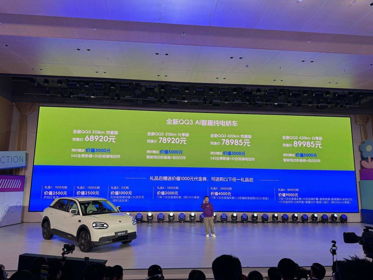 全新QQ3的预售价格体系梯度清晰、定位精准,4款车型覆盖68920-89985元区间,相邻版本价差控制在1万元以内,便于用户按需甄选、精准适配。
