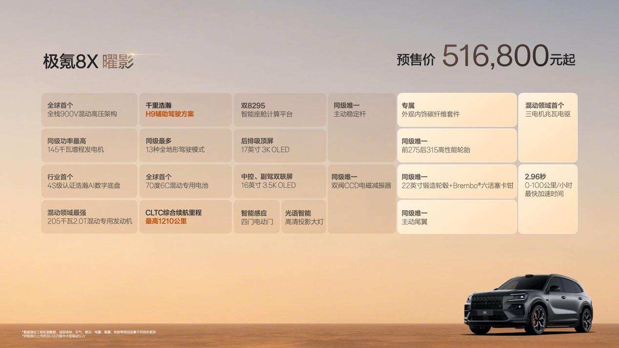 顶配曜影版本预售价51.68万元起,定位全系性能旗舰,搭载三电机兆瓦电驱,零百加速最快2.96秒,跻身全球2秒俱乐部中大型混动SUV行列,主打极致驾控乐趣,瞄准追求性能体验的高端用户。