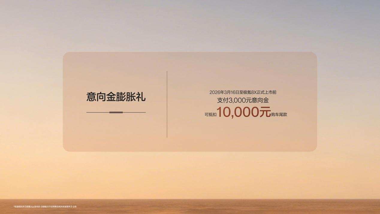 预售权益方面,品牌推出三项实用购车福利,进一步降低用户入手门槛:其一为『意向金膨胀礼』,支付3000元意向金可直接抵扣10000元购车尾款,现金优惠直观易懂。