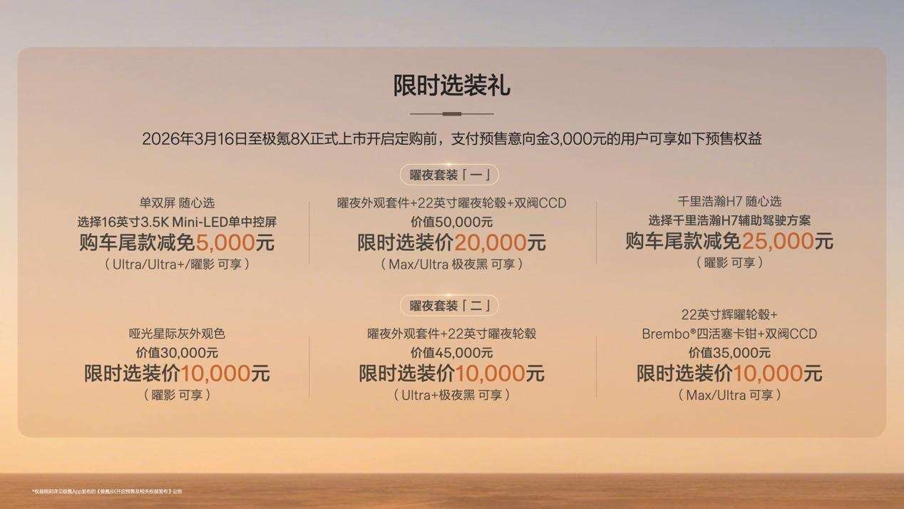 其三为六项『限时选装礼』,涵盖单双屏选配减免、辅助驾驶方案优惠等,用户可按需灵活选配。目前用户可通过极氪App、官方网站、微信小程序及线下体验店完成预订,新车计划2026年第二季度正式上市交付。