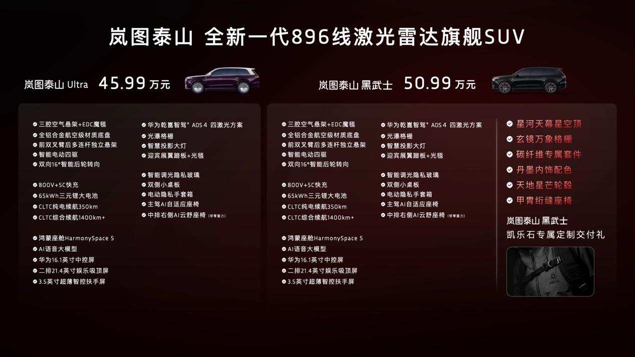 目前岚图已推出了泰山系列四款车型,搭建起一套覆盖37.99万至50.99万元的高端产品矩阵。而今天发布的Ultra版定价45.99万元,并开启量产交付,黑武士版则以50.99万元的价格惊艳亮相,不同版本各有侧重,能满足高端用户的多样需求。