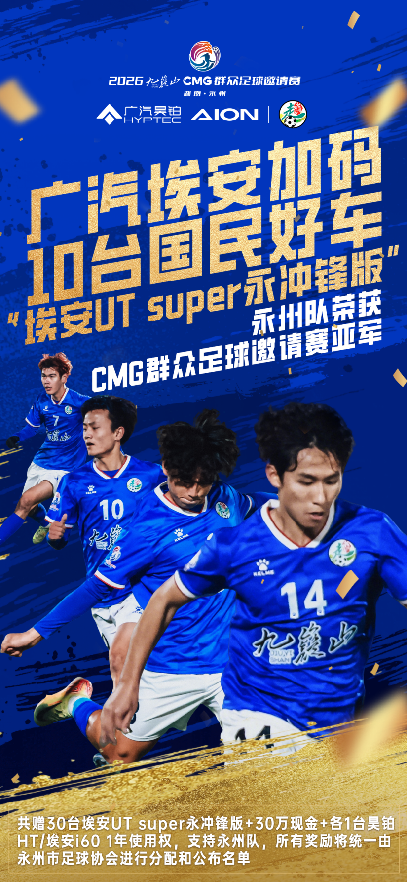 此后,合作步伐持续加快:1月中旬,在永州市政府领导的见证下,为永州队专属定制的埃安UT系列“永冲锋”版正式上市;1月下旬,CMG群众足球邀请赛期间,广汽埃安宣布再加码,通过线上线下向球迷送出多辆实车大奖。
