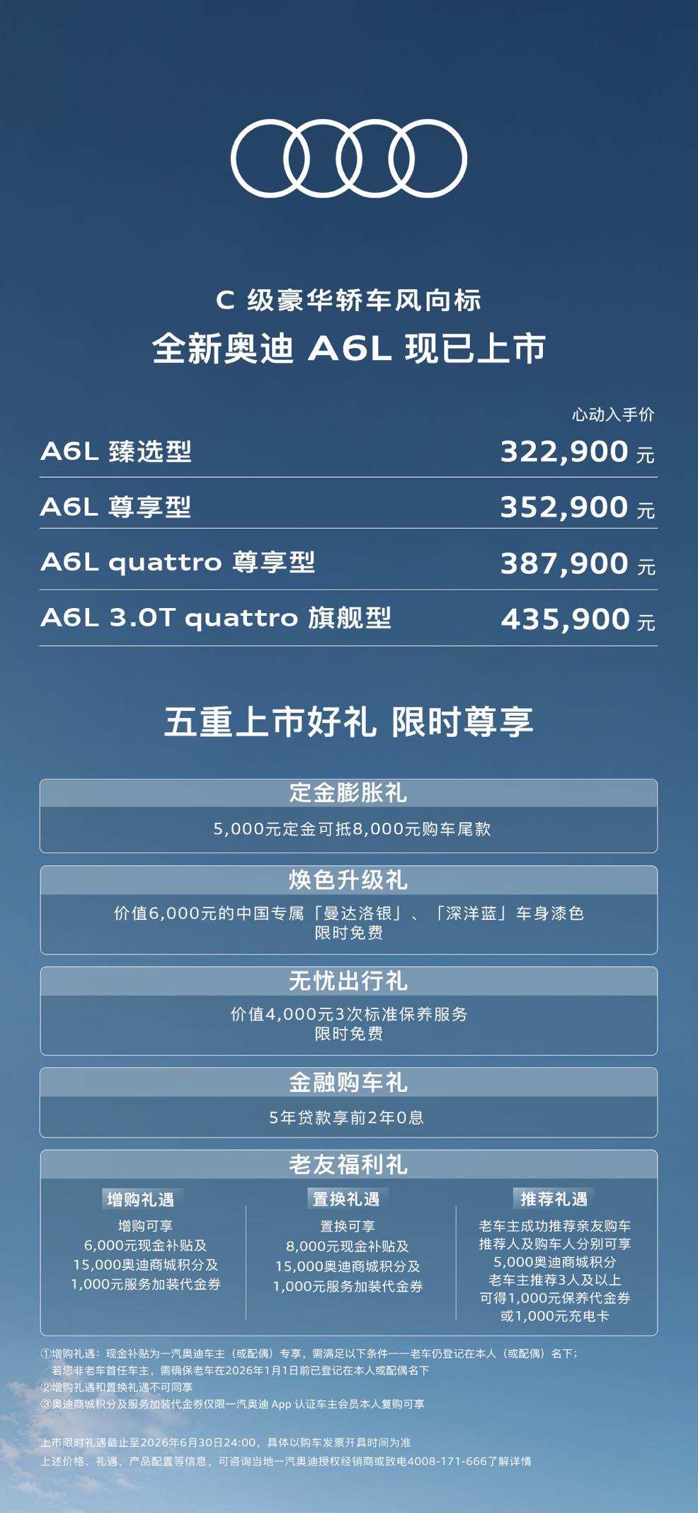 价格方面,全新奥迪A6L以322,900元到435,900元的定价,搭配五重限时上市权益,能满足不同消费层次的购车需求;奥迪A6L e-tron则以313,000元到443,000元的预售价格,加上三重专属礼遇,完成了燃油和电动双线布局的关键一步。全方位升级的产品力,让它能适配商务、家庭、驾控等各种场景,满足不同车主的需求。