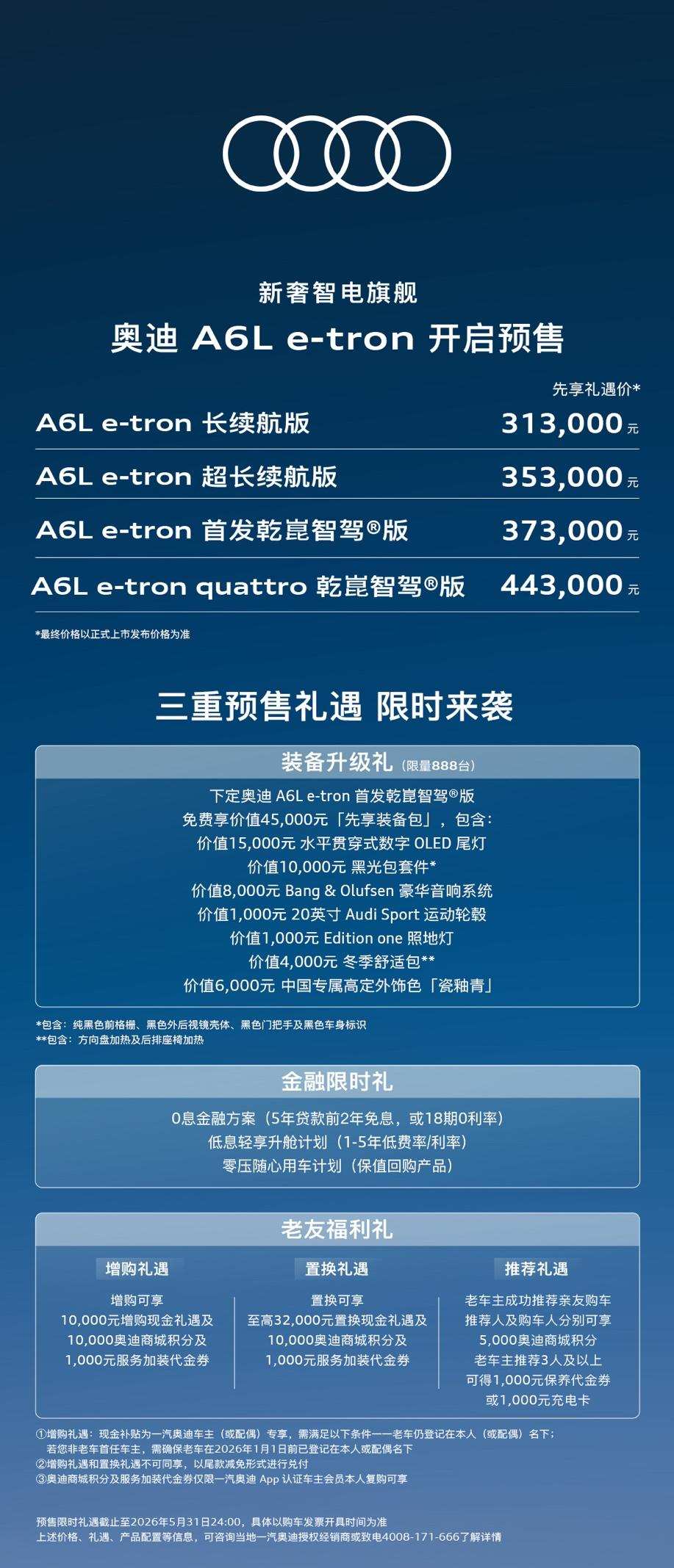 与此同时,作为新奢智电旗舰的奥迪A6L e-tron也同步开启预售,四款版本的先享礼遇价也公布了:A6L e-tron长续航版313,000元、A6L e-tron超长续航版353,000元、A6L e-tron首发乾崑智驾®版373,000元、A6L e-tron quattro乾崑智驾®版443,000元(最终价格以正式上市为准)。
