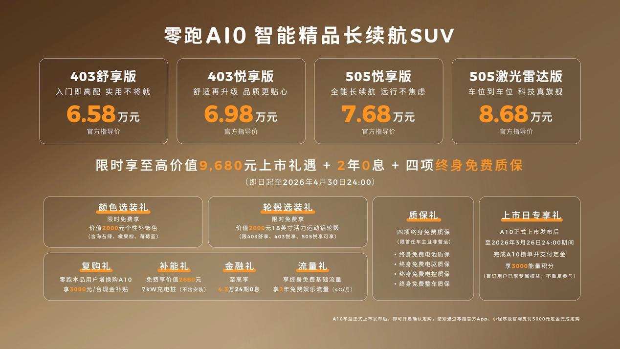 为进一步彰显产品诚意,自上市之日起至2026年4月30日24:00,零跑A10同步推出限时上市权益,覆盖选装、复购、补能、金融、流量、质保等多个维度,限时权益总价值最高可达9680元,为意向用户提供更具性价比的购车选择。