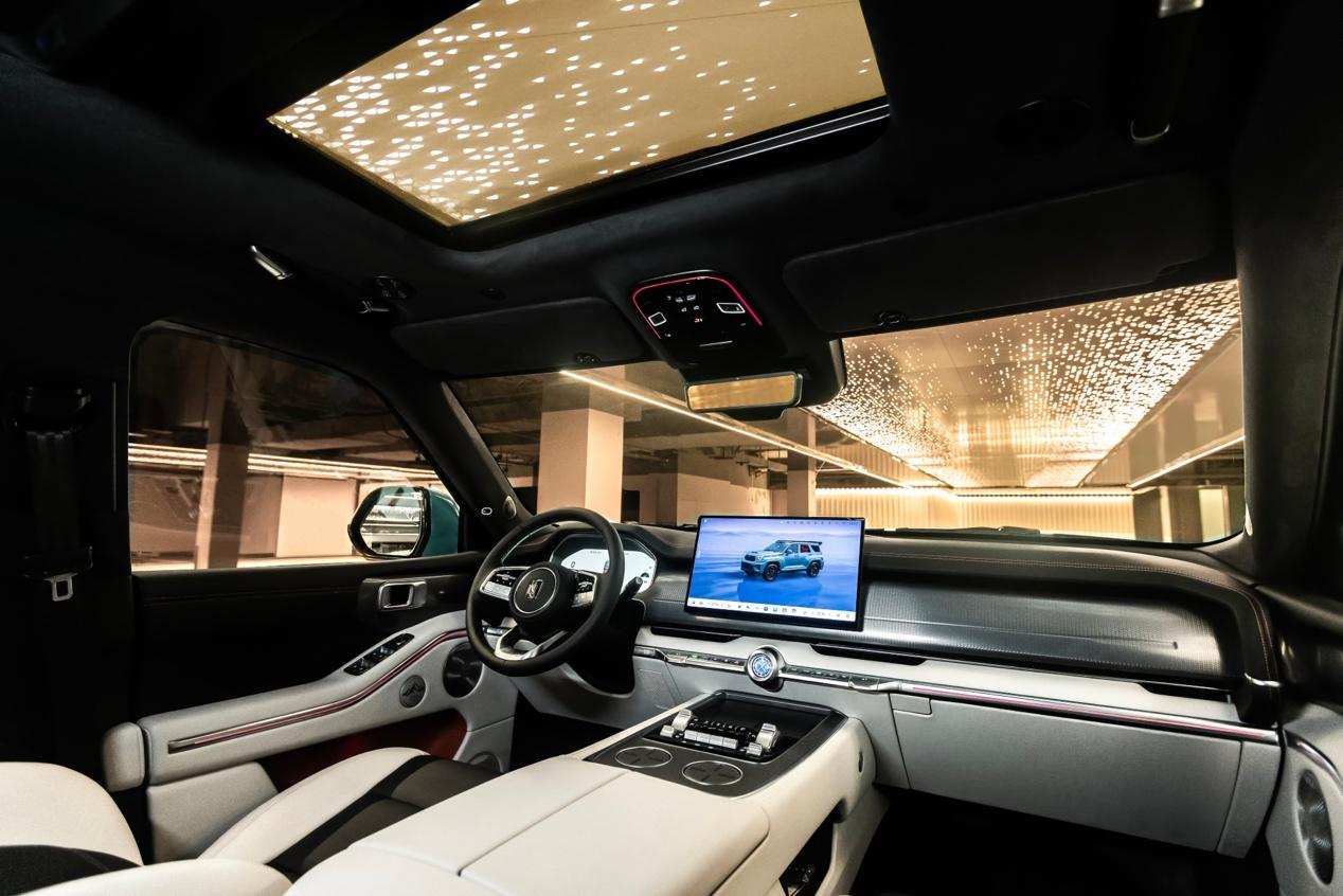新车采用前高后低的昂扬姿态,妥妥复刻了麒麟昂首蹲坐的磅礴气场,车身尺寸达到5105×2061×1985mm,还标配22英寸超大尺寸的米其林轮胎,近1:1的车身高宽比,把麒麟肩宽背厚、身形雄健的样子还原得十分到位,就算安安静静待在那儿,也自带旗舰级的强大气场。