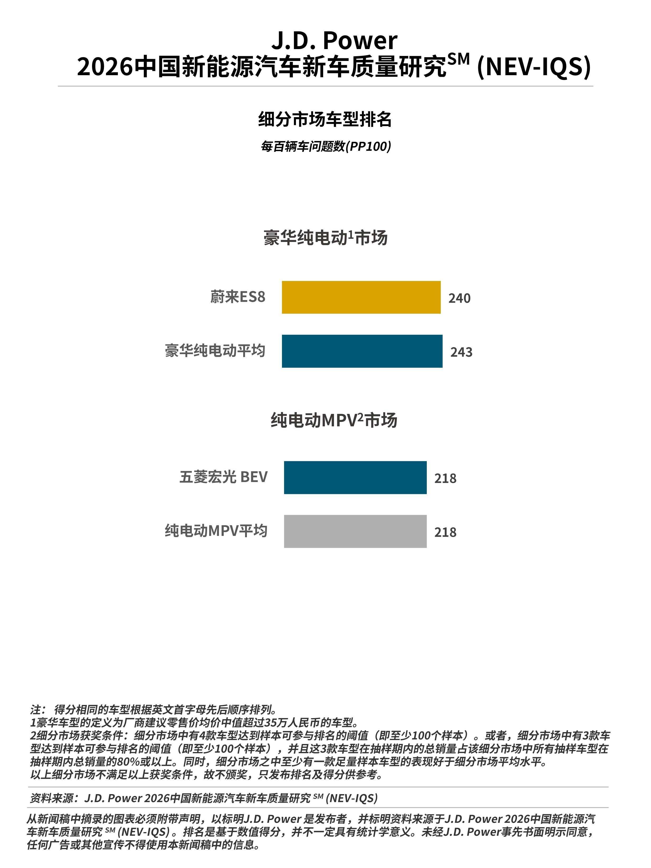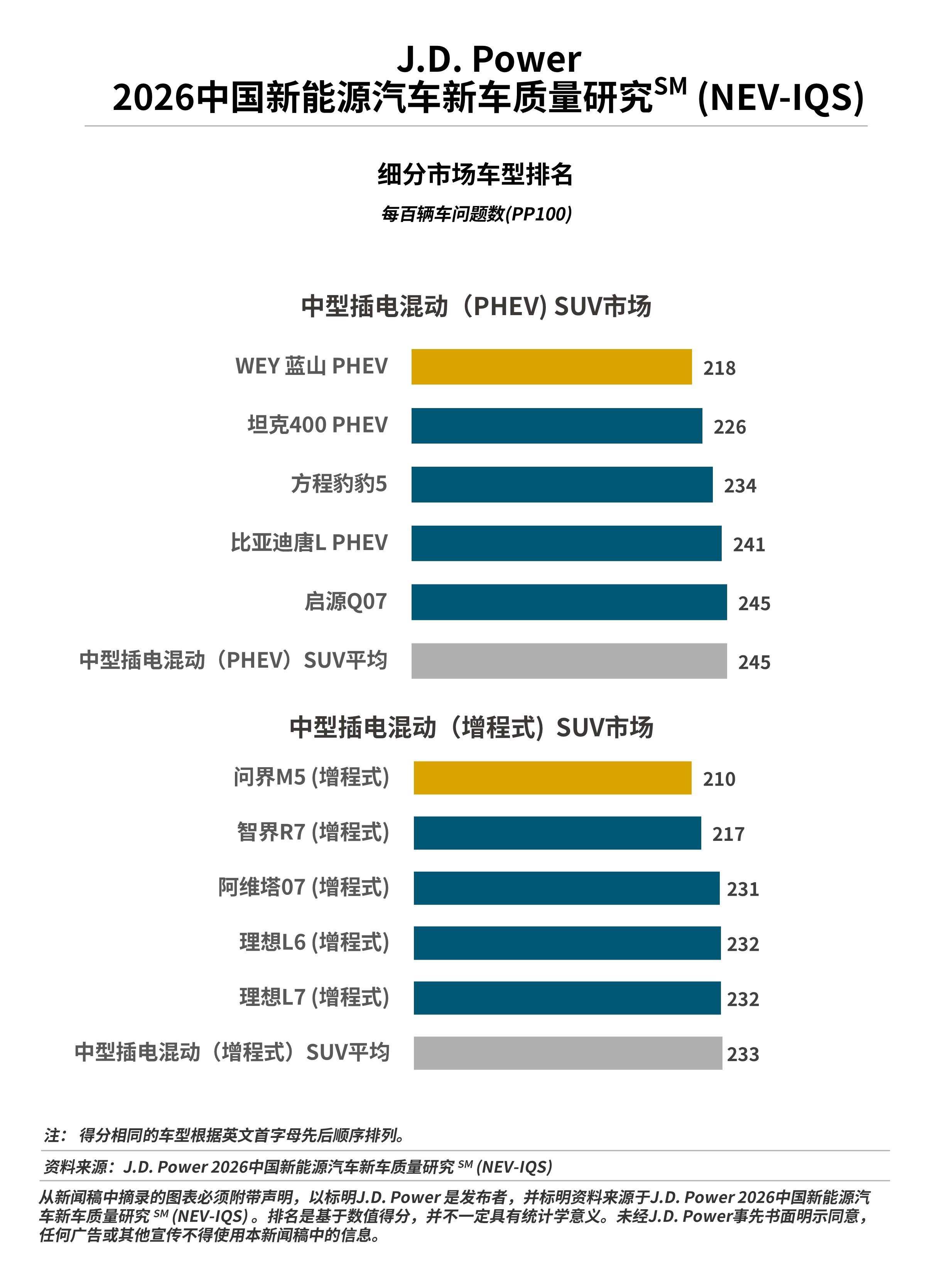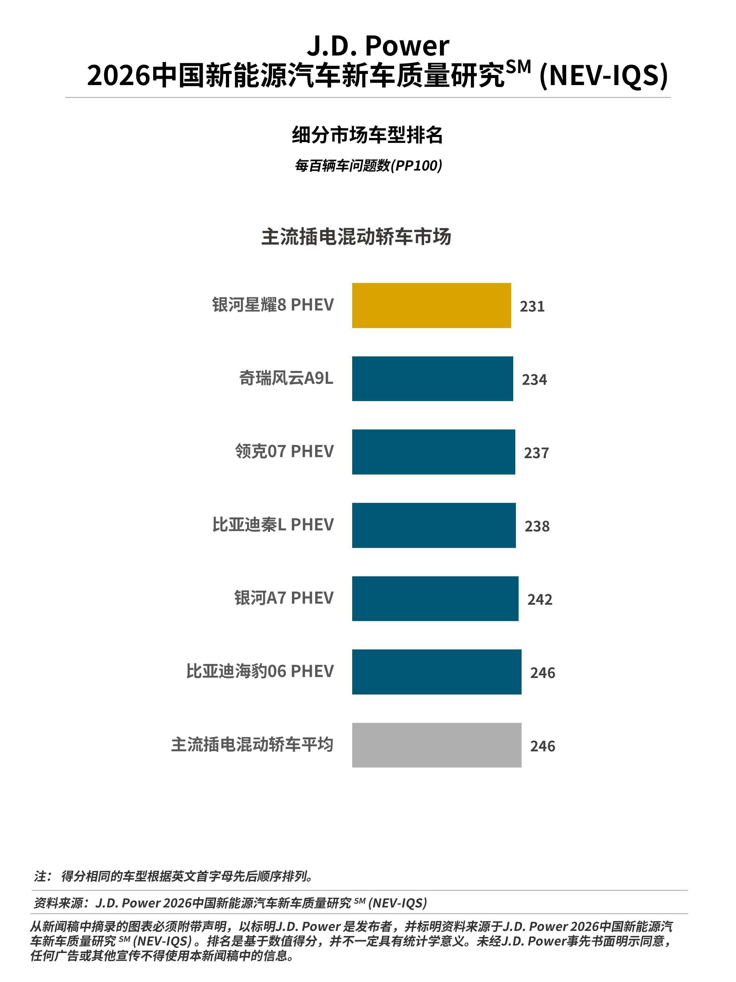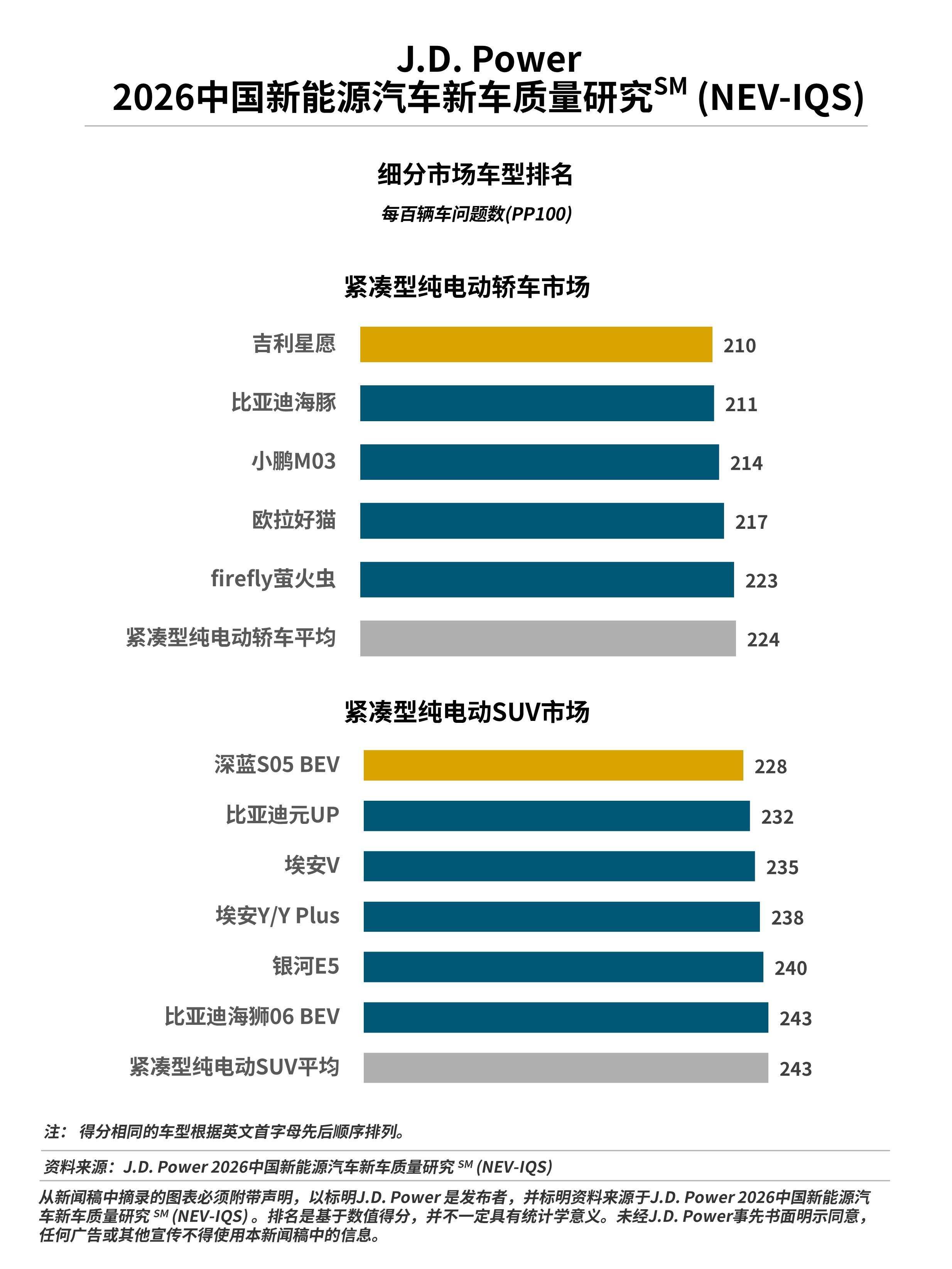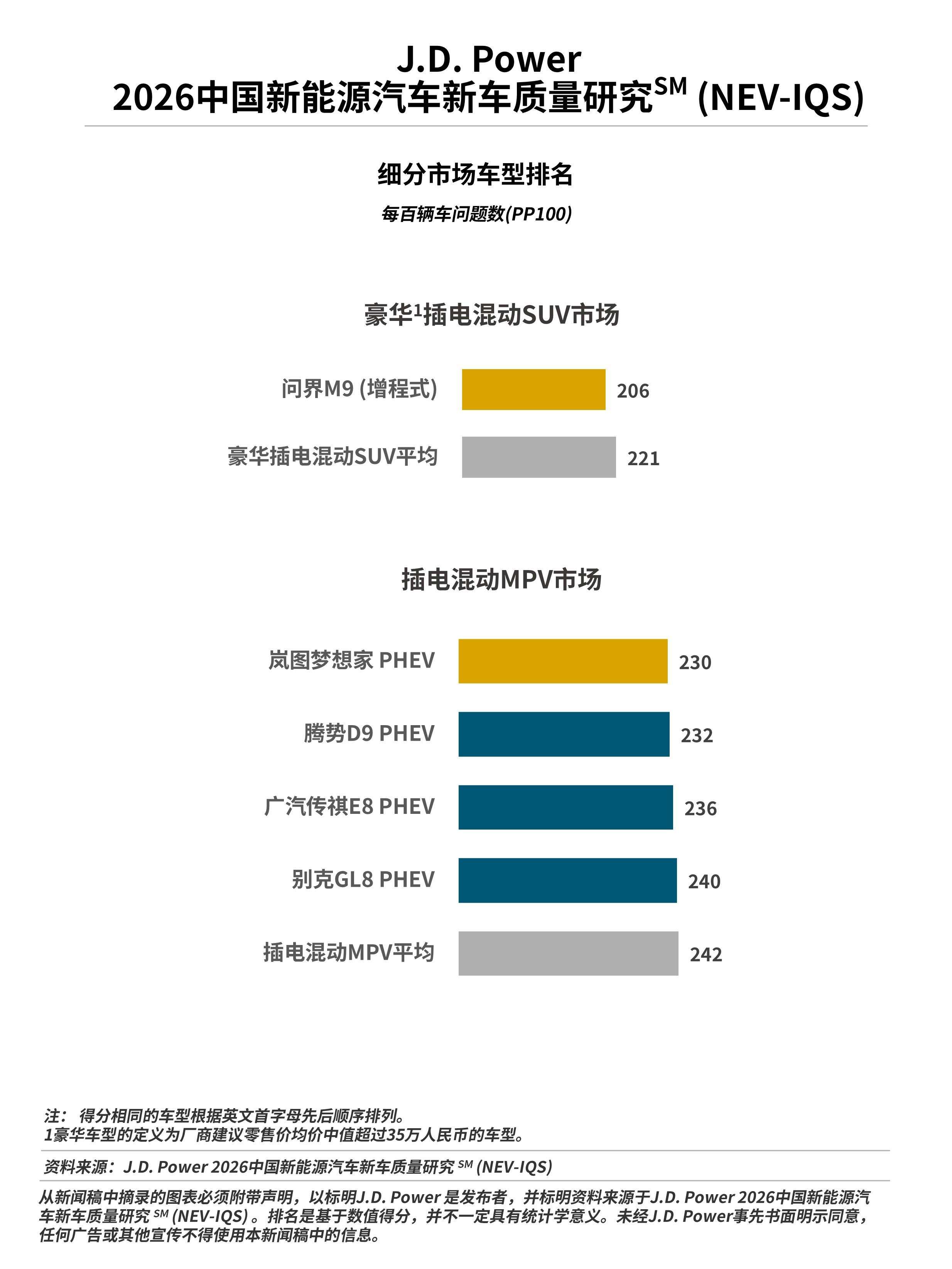 2026年4月2日,上海 — 全球领先的消费者洞察与市场研究机构J.D. Power|君迪今日正式发布2026中国新能源汽车新车质量研究SM(NEV-IQS),是J.D. Power连续第八年在中国发布这一研究,该研究基于J.D. Power行业通用的新车质量研究IQS体系,并针对新能源车特有问题进行补充,该研究统计和衡量了新能源汽车新车车主在2至6个月的拥车期内遇到的质量问题。新车质量以平均每百辆车问题数(PP100)表达,问题数越低,质量越好。