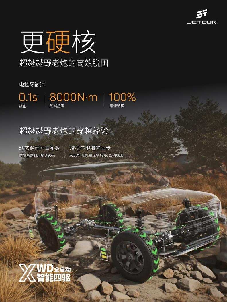 此外,电控牙嵌差速锁的加入,让车辆拥有更强的脱困能力,0.1秒即可完成锁止,实现100%扭矩转移,轮端扭矩最高可达8000N·m,面对泥坑、交叉轴等极限路况时,能够帮助车辆快速脱离困境。