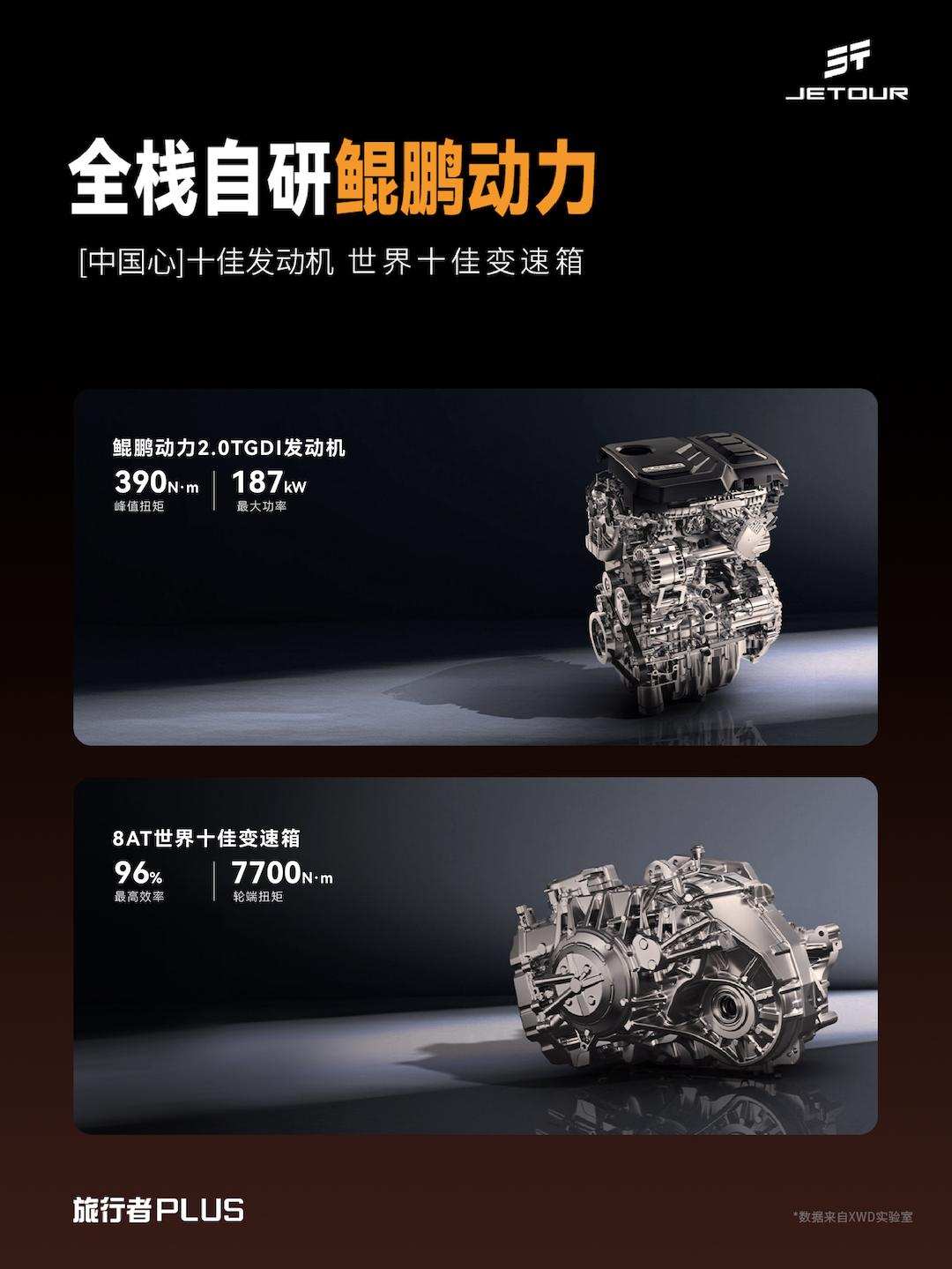 动力层面,捷途旅行者PLUS全系搭载鲲鹏动力2.0TGDI发动机与8AT变速箱,峰值功率187kW,峰值扭矩390N·m,搭配XWD全自动智能四驱系统,车辆接近角28°、离去角23°,最小离地间隙220mm,涉水深度700mm,具备不错的全路况通过能力。