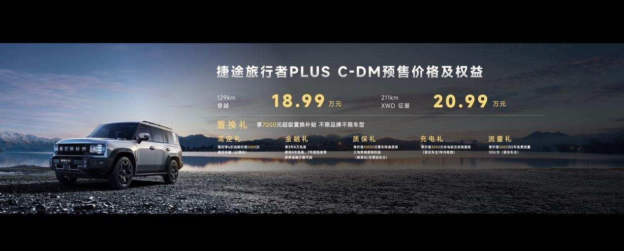 针对两款预售车型,捷途推出了相应的购车权益。其中,旅行者PLUS用户可享受10000元不限品牌置换补贴、3年8万免息贷款、整车终身质保等权益。而旅行者PLUS C-DM用户则可享受7000元不限品牌置换补贴、整车及三电终身质保、免费充电桩及安装服务等权益。
